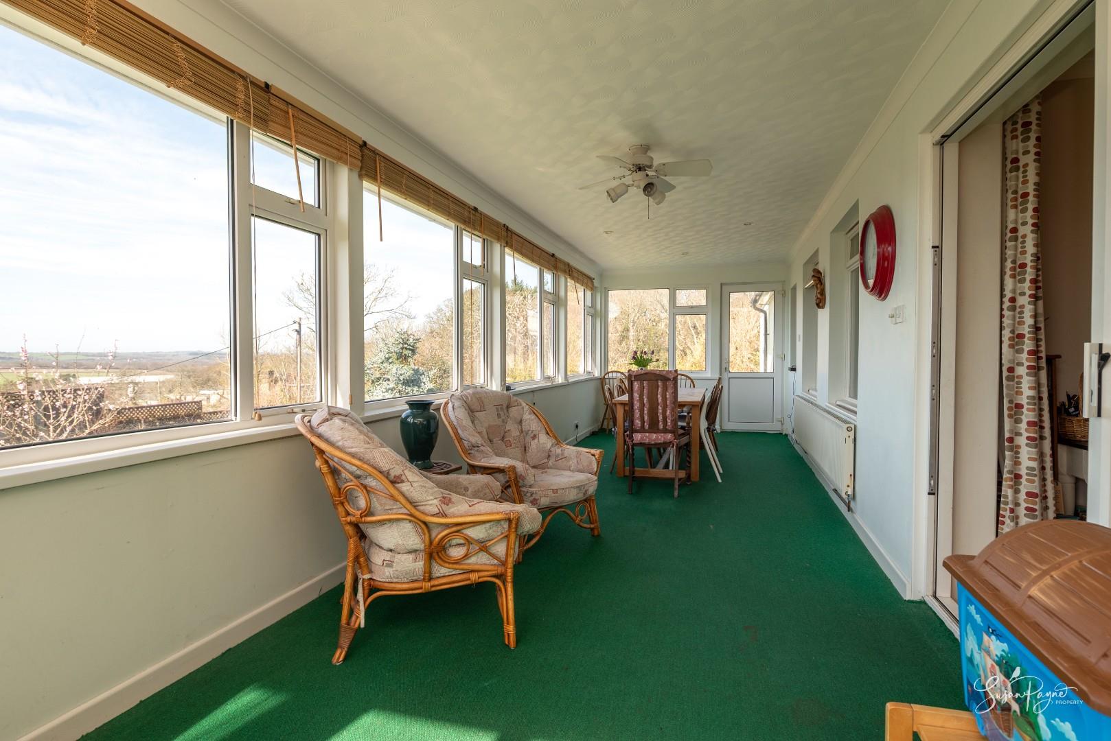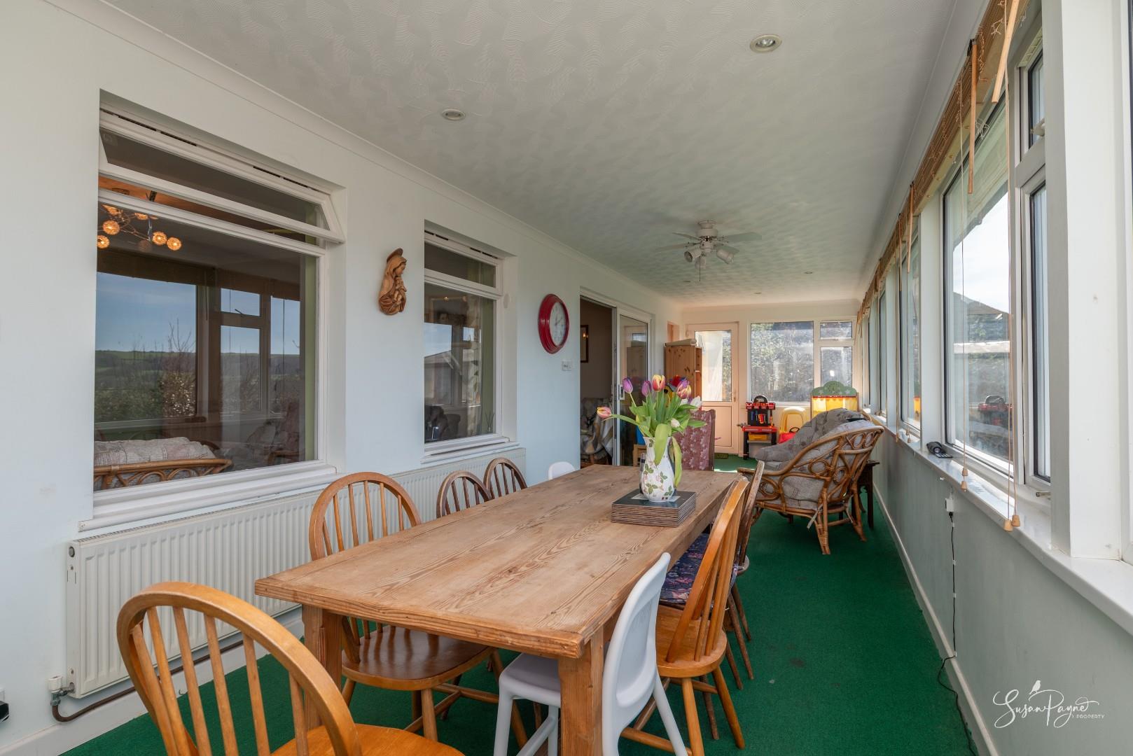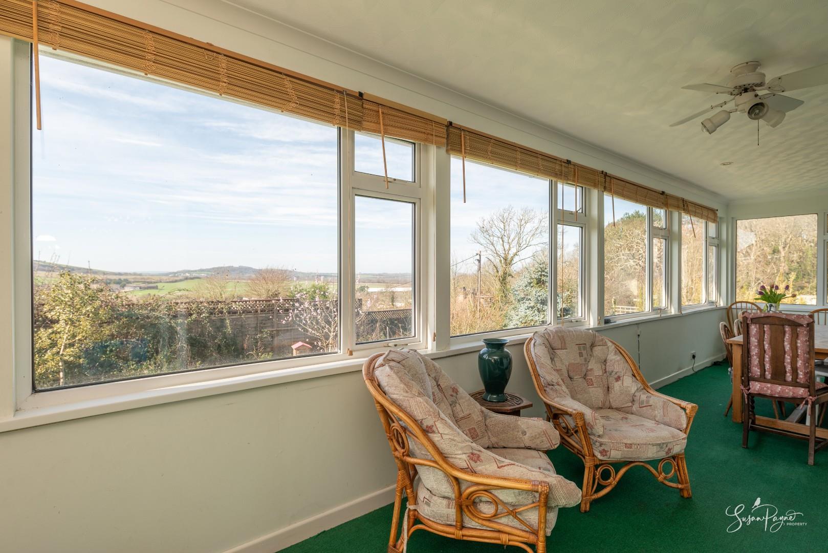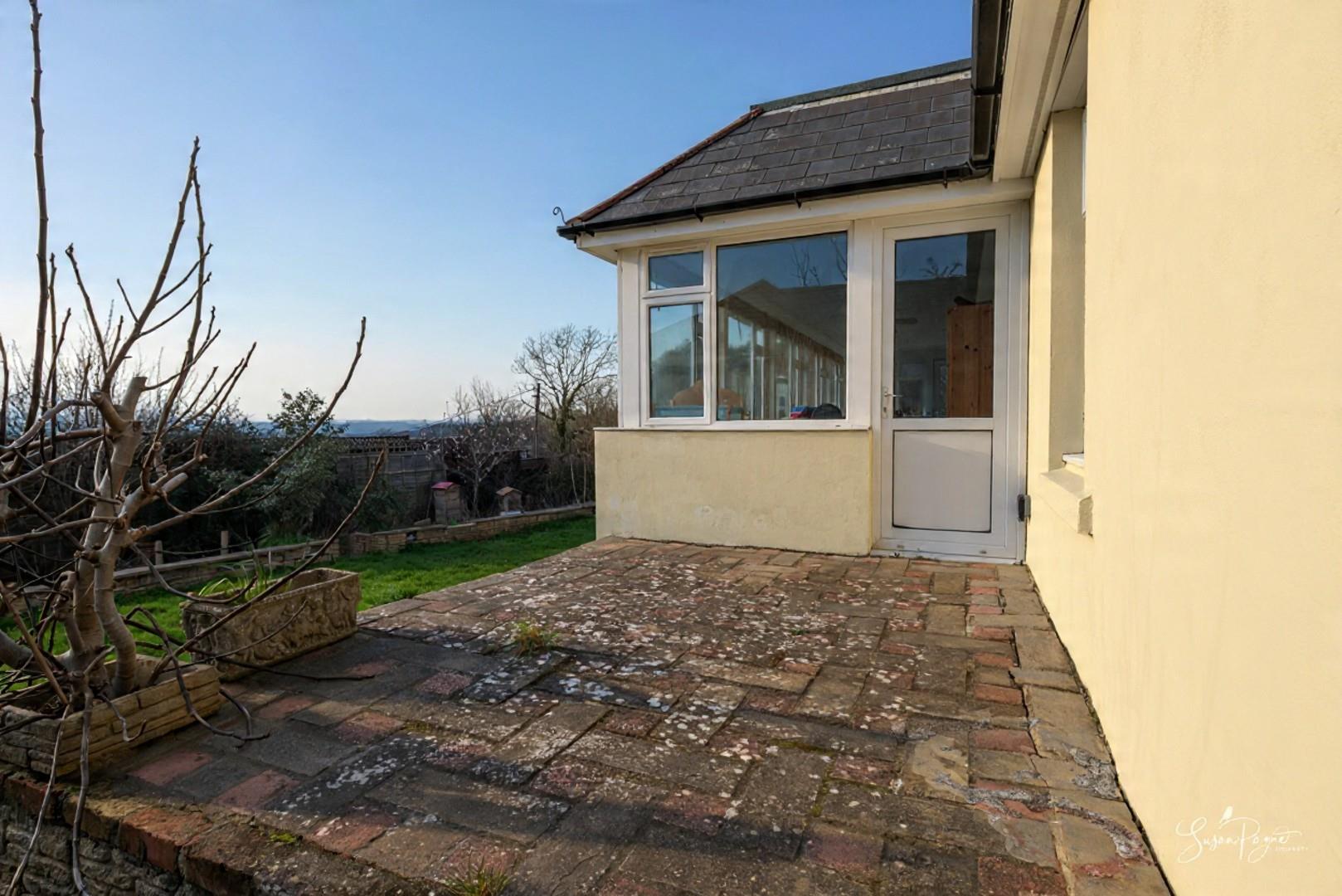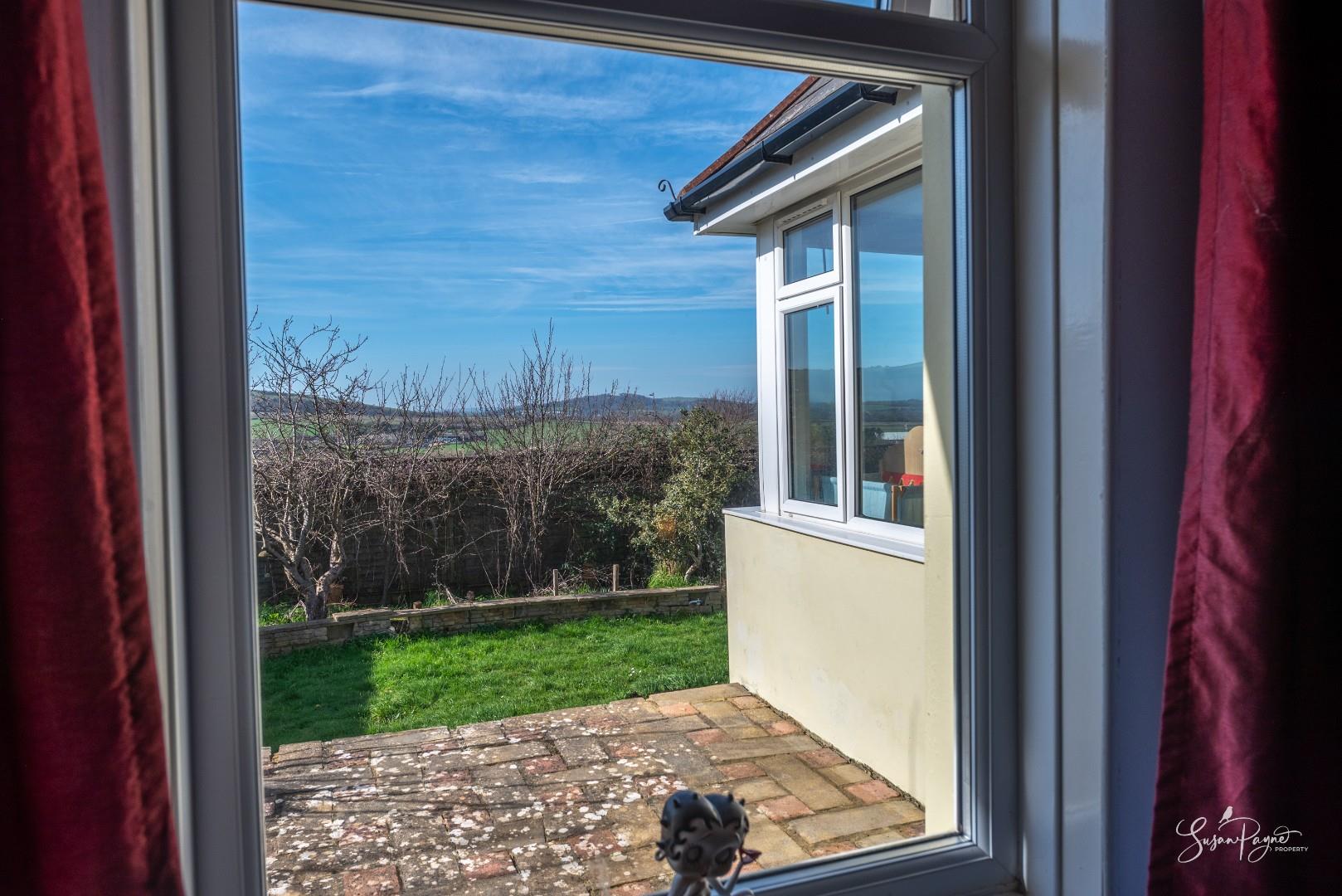 Spanning almost the whole width of the bungalow to the rear, this fantastic conservatory offers additional space for dining and lounging, as well as providing a front row seat to stunning, far-reaching views to the west, including sunsets all through the year. There are two doors to either side, one leading to an elevated patio area, and the other into the garden via a ramp.