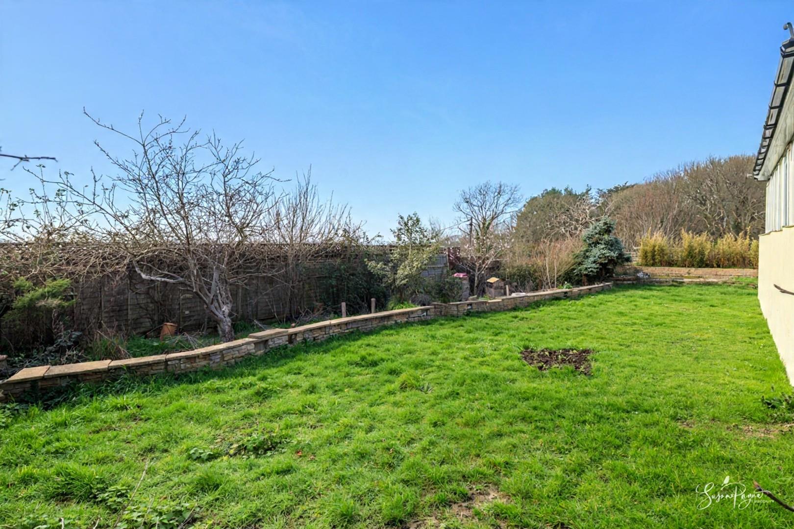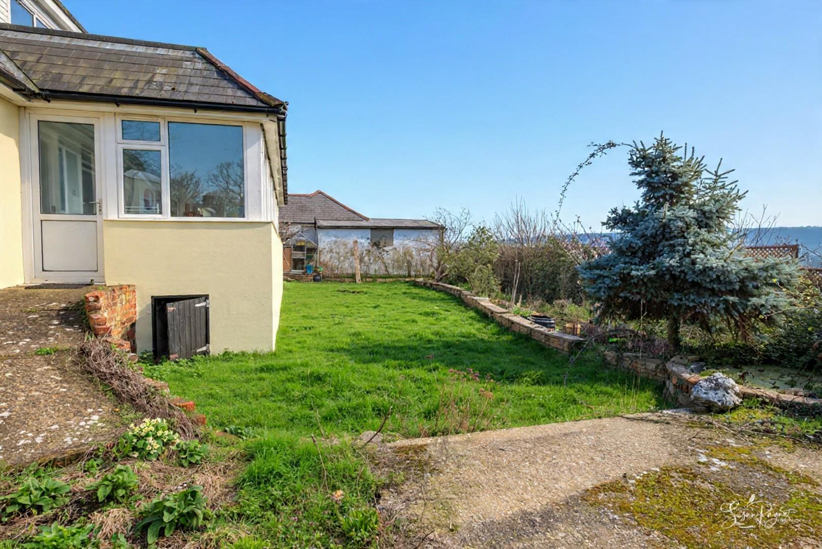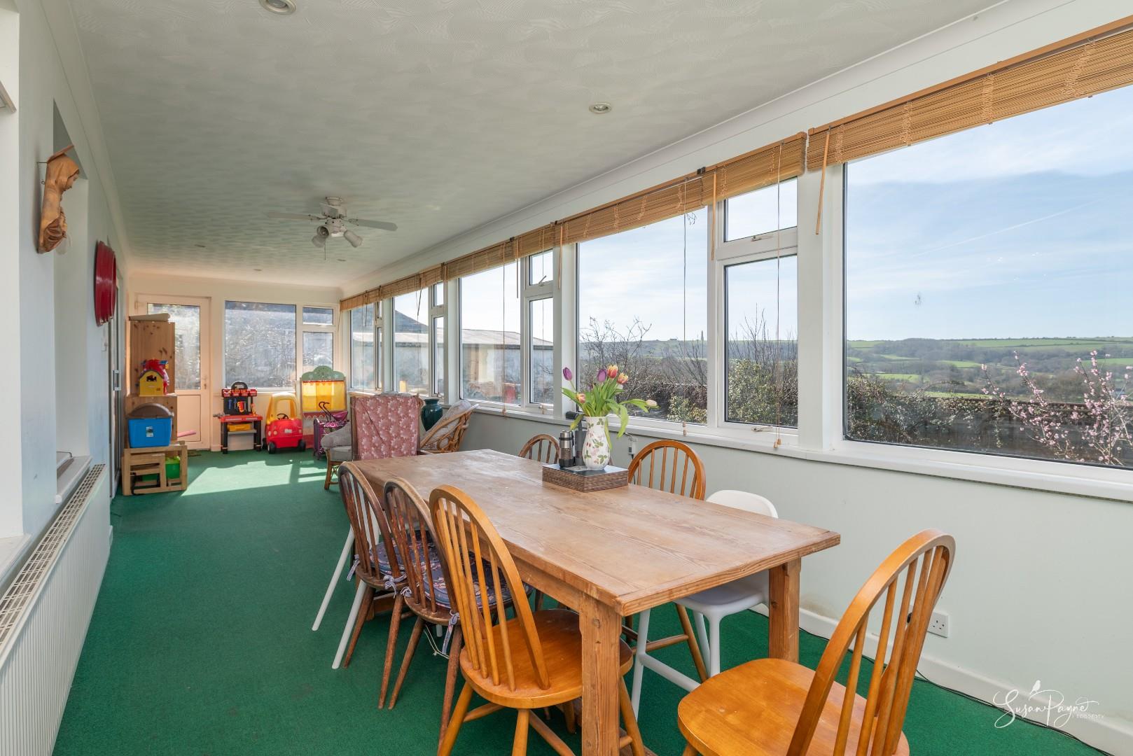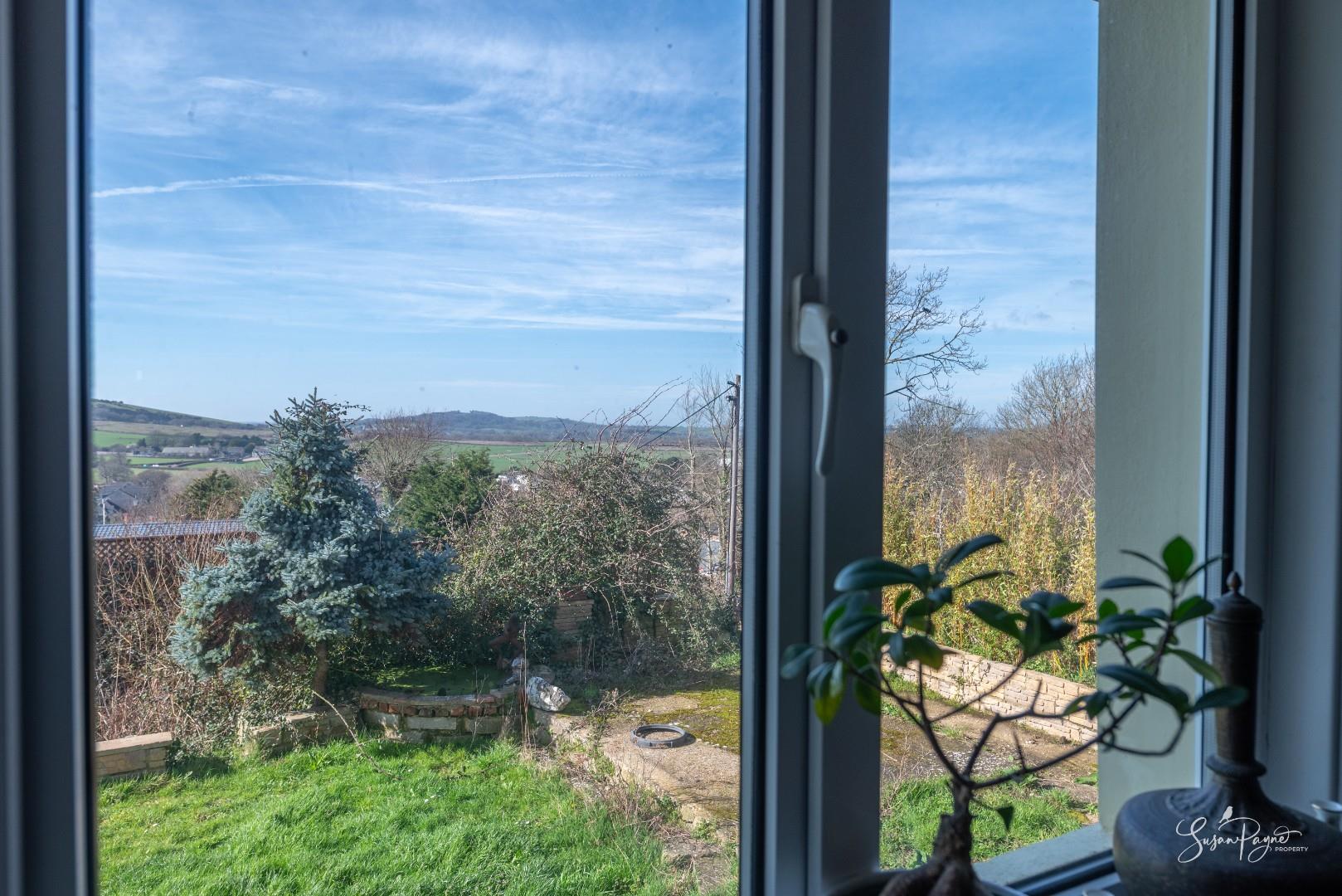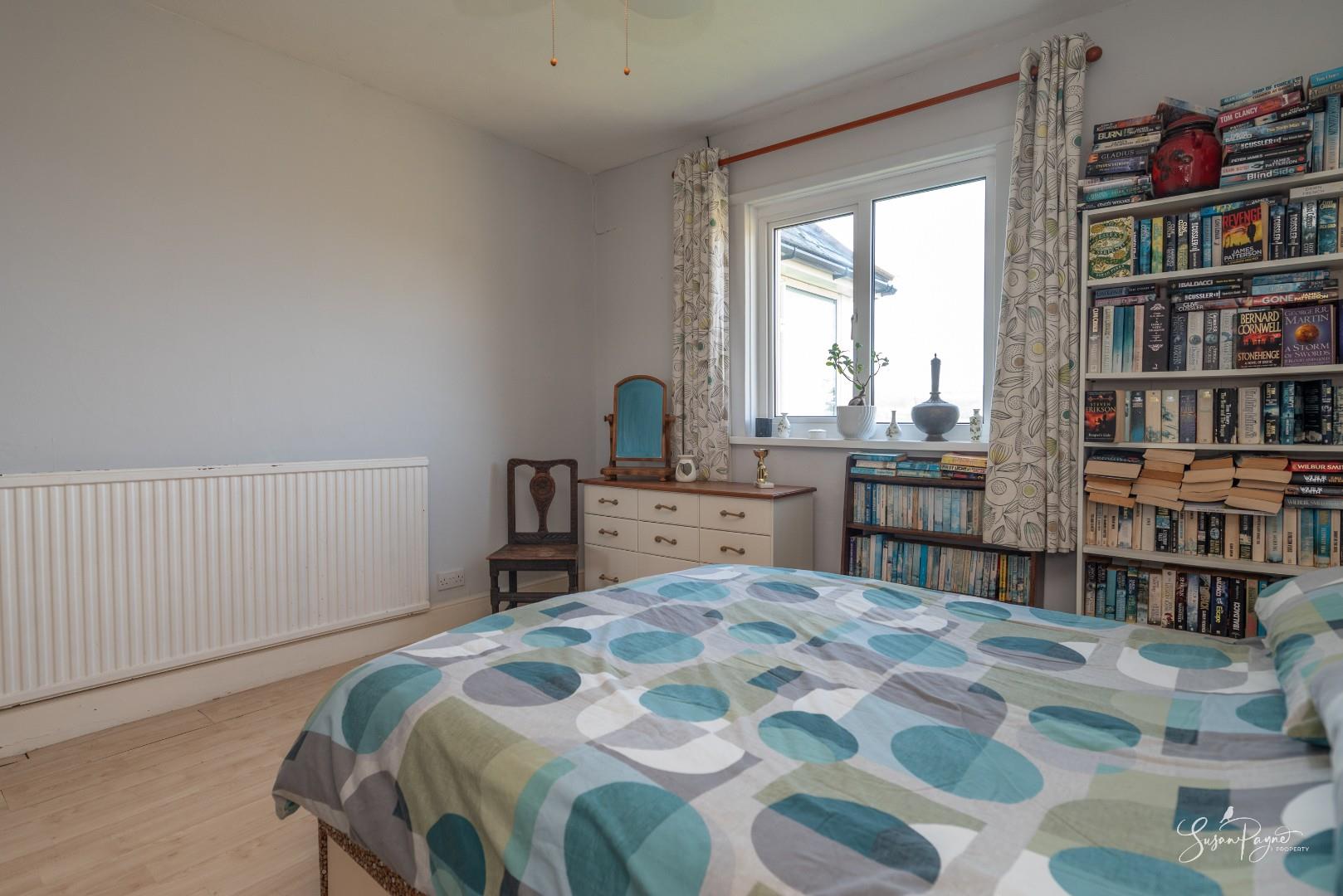 Spanning almost the whole width of the bungalow to the rear, this fantastic conservatory offers additional space for dining and lounging, as well as providing a front row seat to stunning, far-reaching views to the west, including sunsets all through the year. There are two doors to either side, one leading to an elevated patio area, and the other into the garden via a ramp.