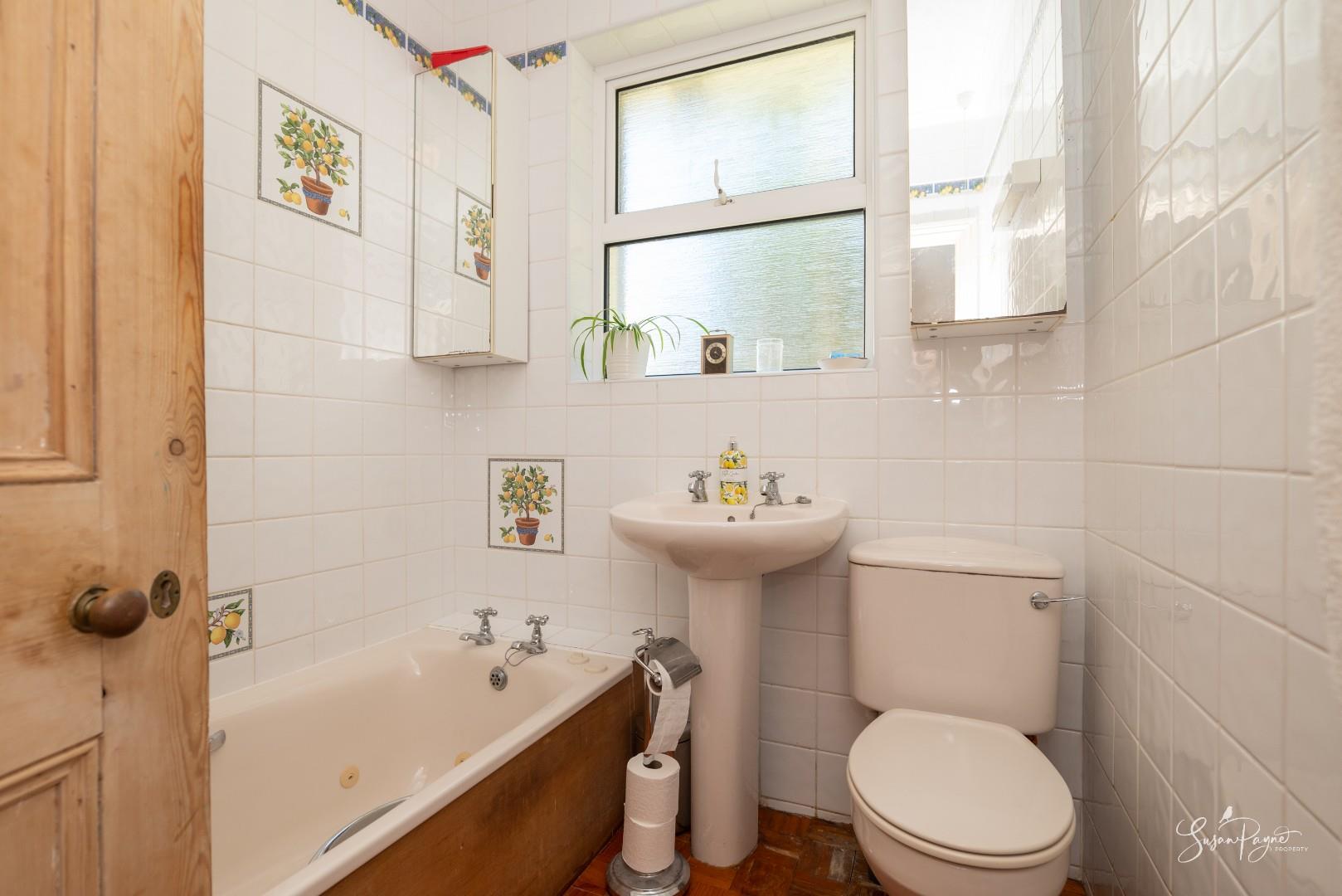 Servicing bedroom one and bedroom six, this family bathroom comprises a bath, a handbasin, and a WC, plus it benefits from an obscure glazed window to the front aspect.
