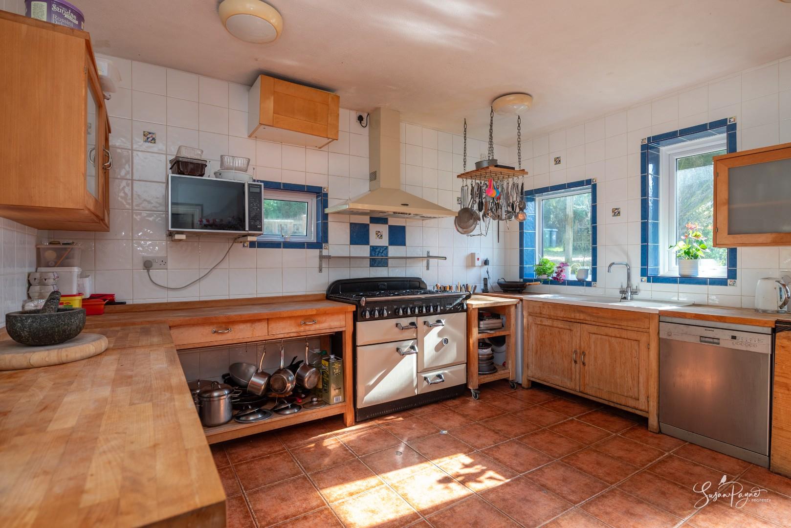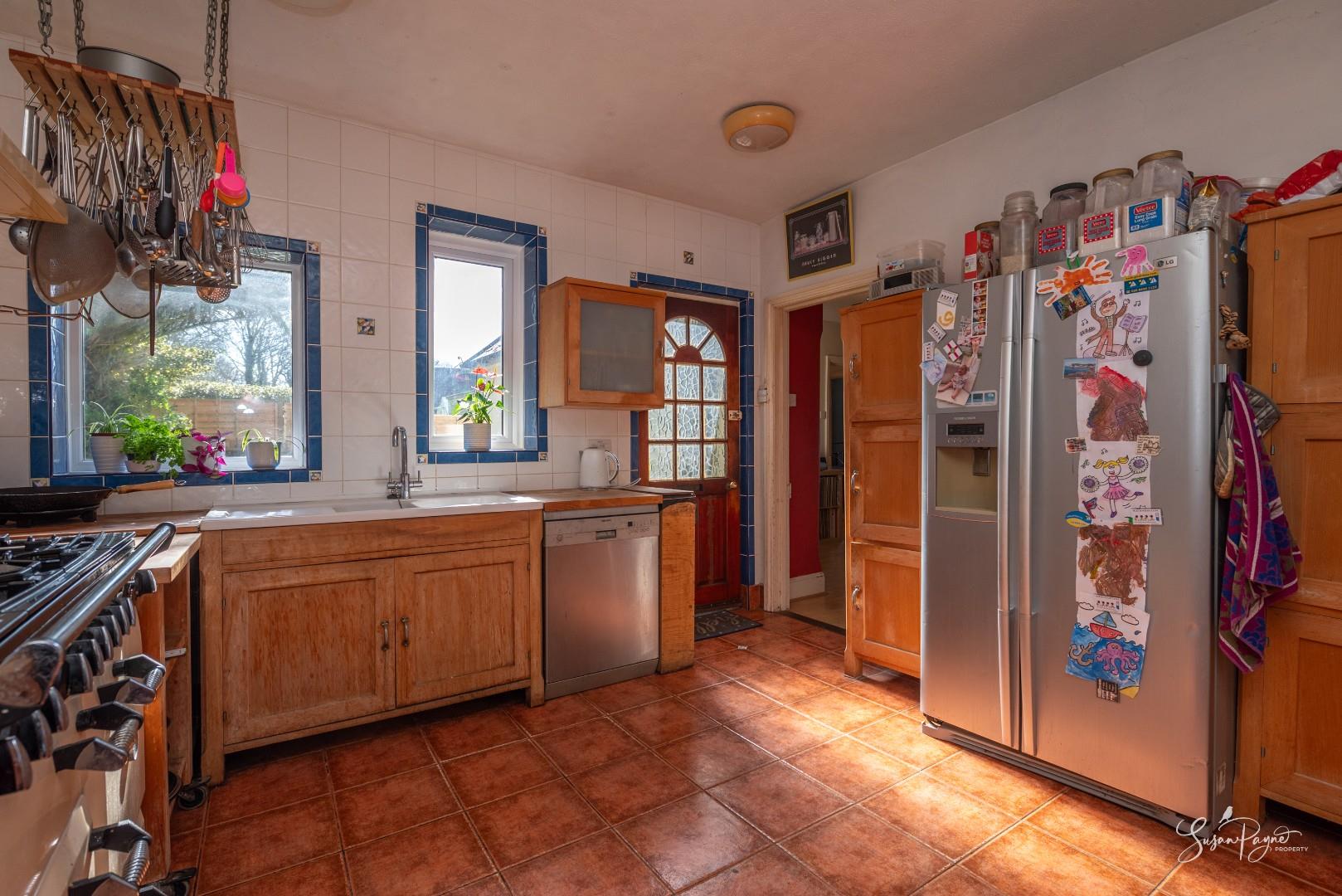 The kitchen is a generous and practical space with extensive worktop areas and a range of freestanding cabinetry. Positioned to overlook the front garden and driveway, the room offers excellent potential for redesign or modernisation to create a contemporary family kitchen, if desired.