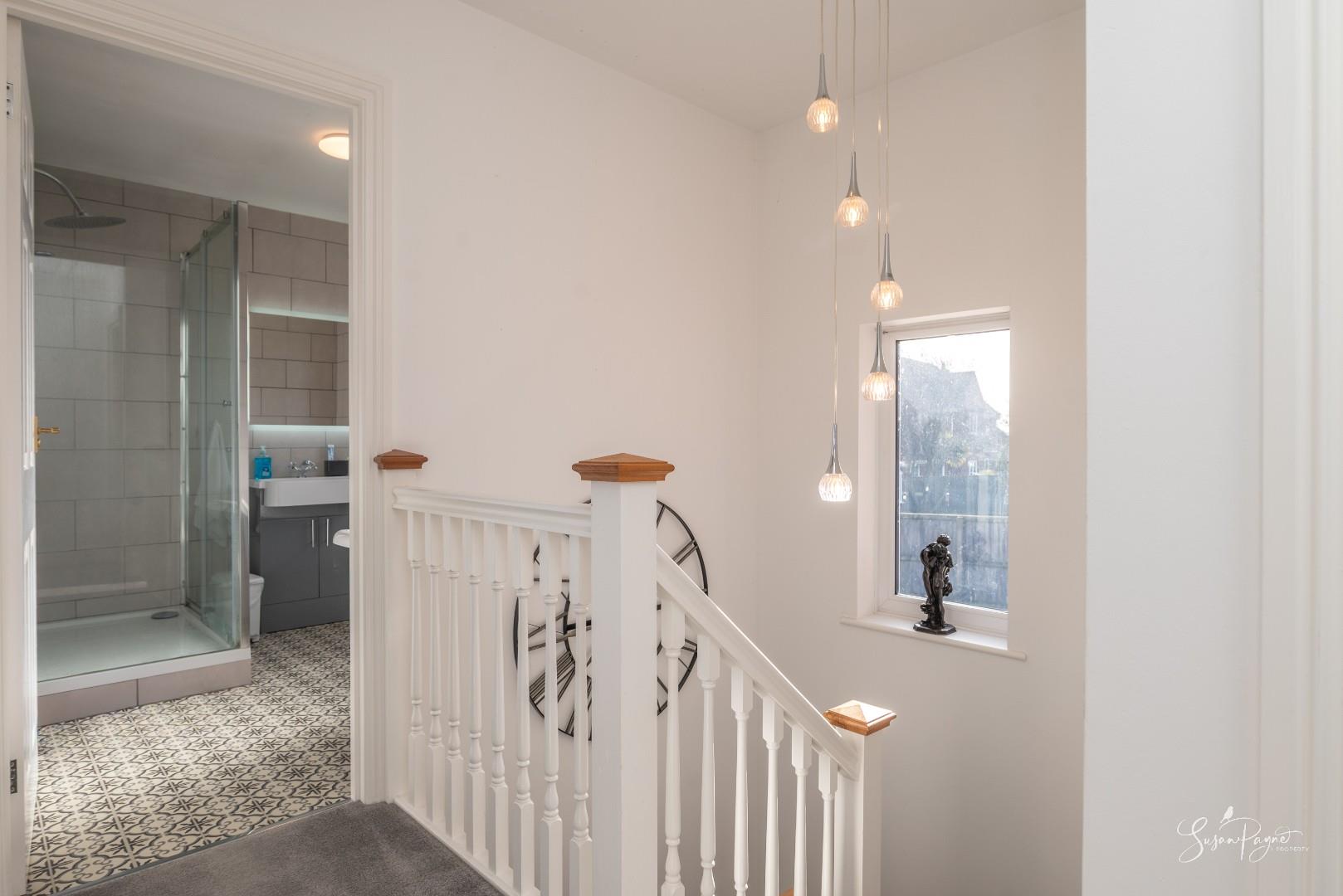 The turning stairwell features a stair runner which leads up to the first-floor landing. The space enjoys a window to the rear aspect, enjoying sunshine all day.