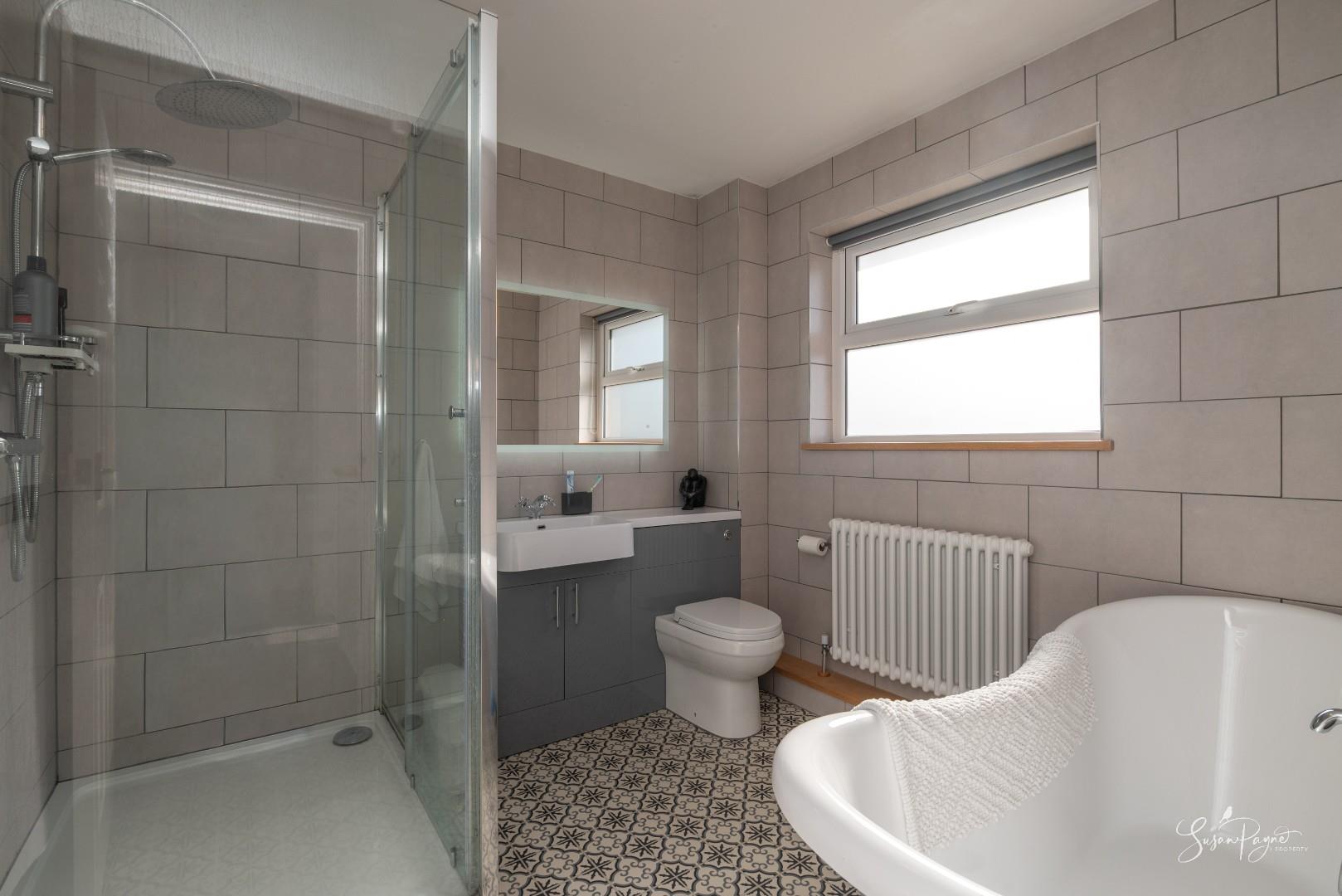 Fully equipped, this stunning modern bathroom comprises a large shower cubicle, a beautiful roll top bath, and a unit incorporating a hand basin and a WC. There is a large illuminated light and an obscure glazed window to the rear aspect. The space is finished with neutral wall tiles and a patterned floor vinyl.