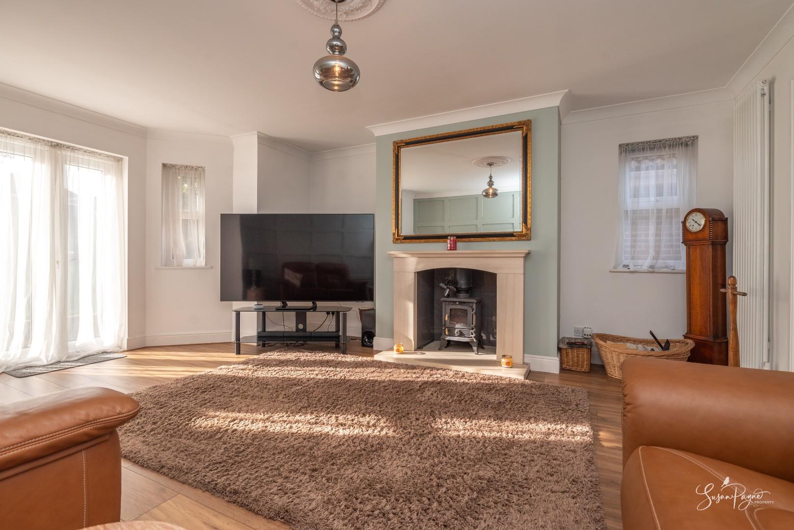 Generously proportioned and filled with natural light from the attractive bay window, the lounge offers a welcoming space for relaxation. A feature fireplace with a log burner creates a focal point and keeps the room cosy, while French doors lead out to the garden.