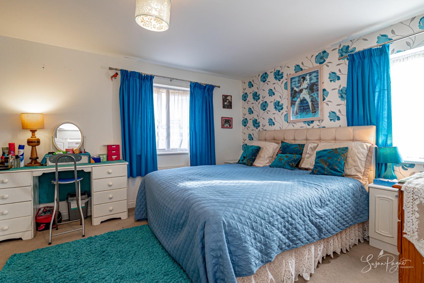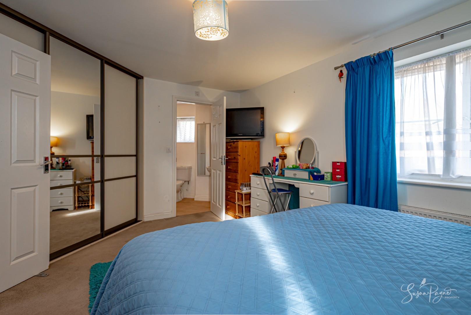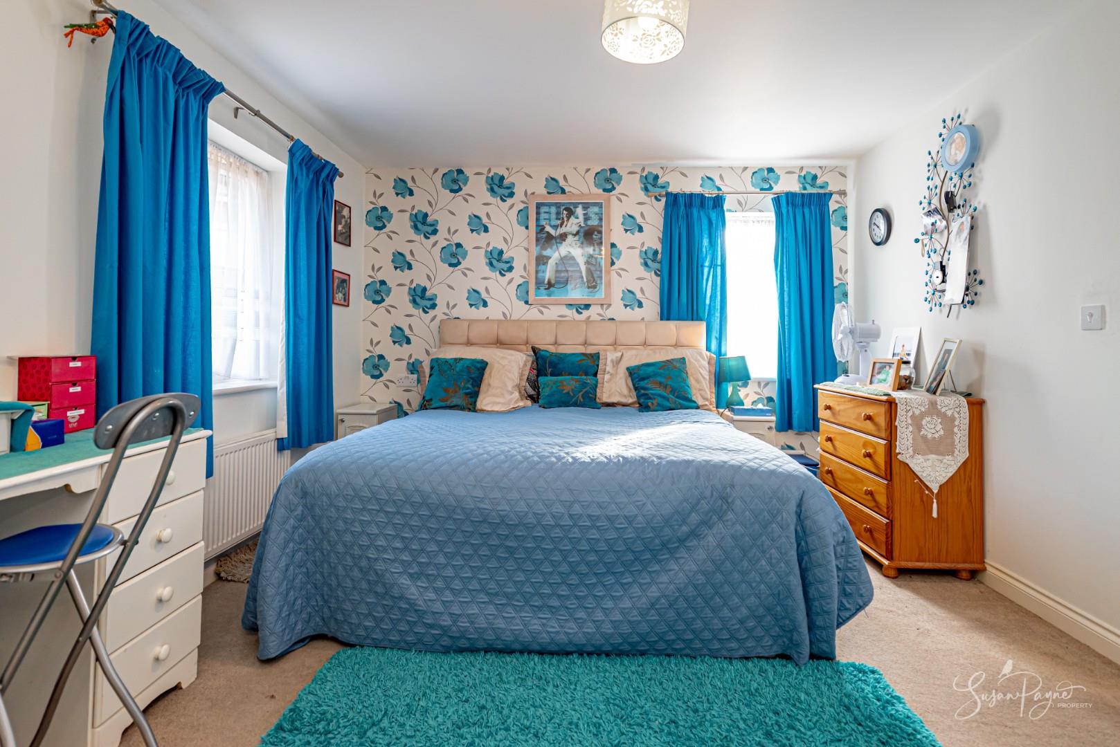 Enjoying a dual aspect with a window to the front and side, this carpeted bedroom is spacious and finished with neutral interiors including a blue floral papered feature wall. Fitted with a radiator and pendant light fitting, this room also benefits from an en-suite shower room and a triple built-in wardrobe with sliding doors incorporating a mirror.