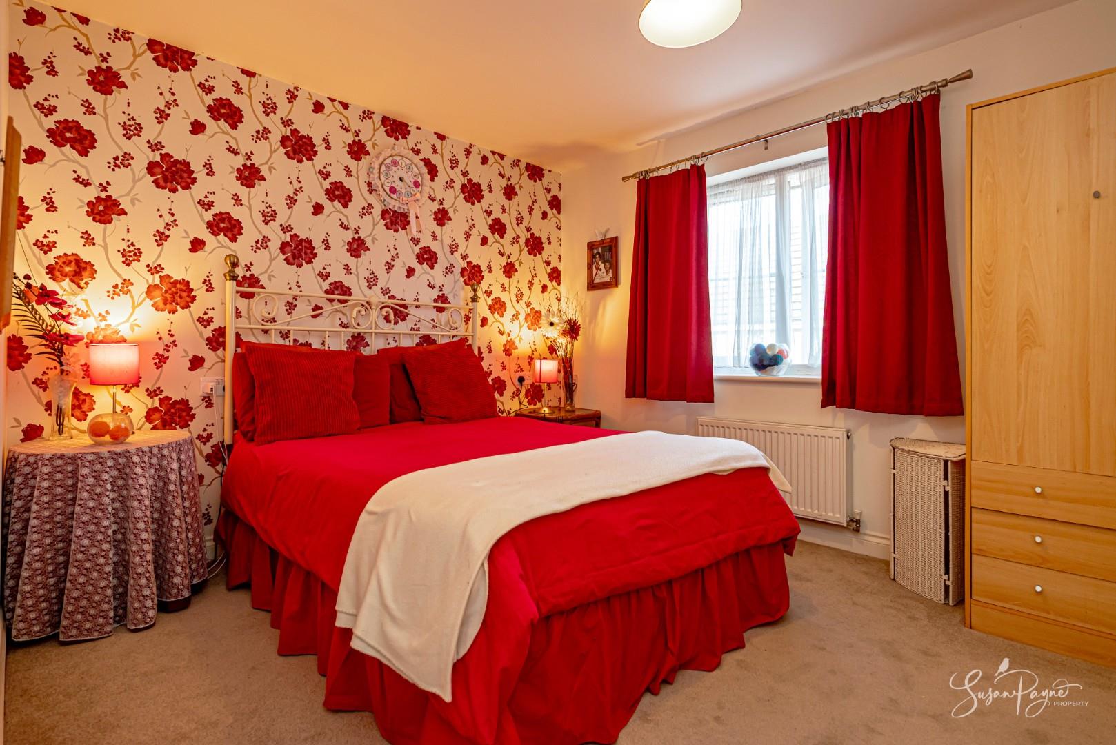 Featuring a window to the front aspect with a radiator beneath, this double bedroom benefits from access to two, large recessed storage cupboards, with one housing a water tank. Lit by a pendant light fixture, this carpeted bedroom is dressed with a neutral decor which includes a red floral papered feature wall.