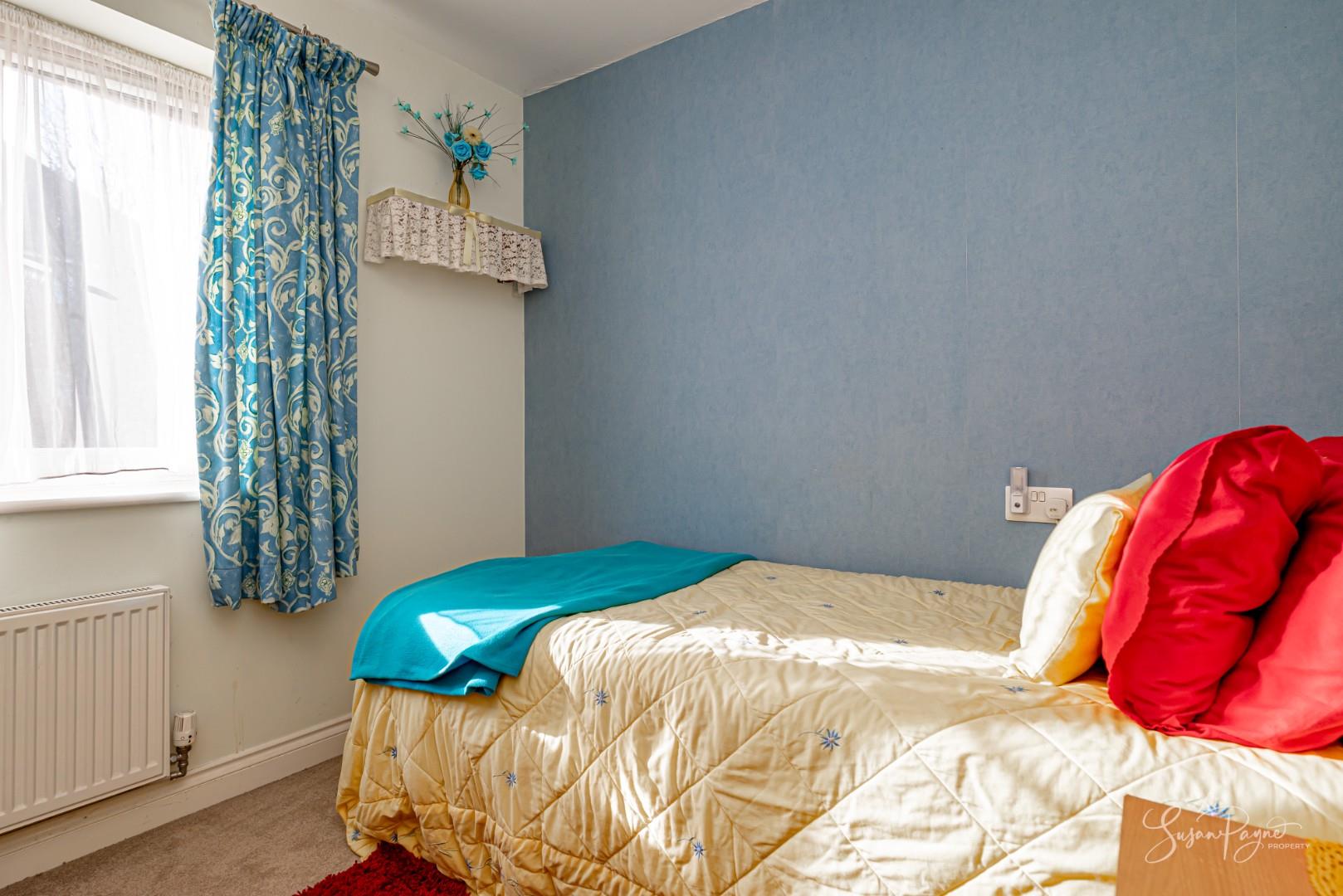 Dressed with light yellow walls and a light blue feature wall, this carpeted bedroom offers a single size and has a window to the rear aspect with a radiator beneath to provide warmth. A pendant light fixture is also located here.