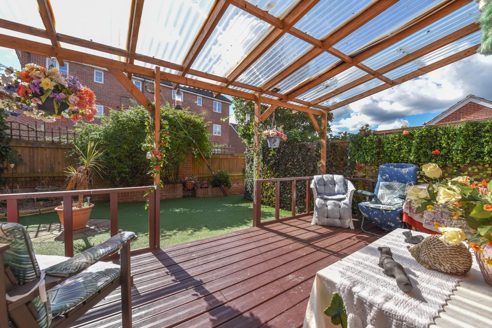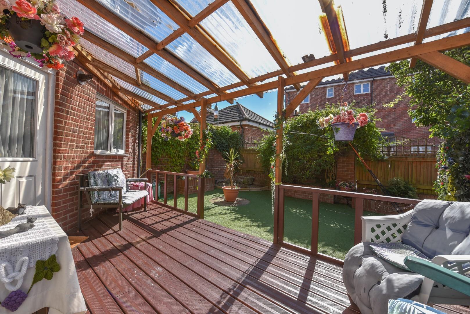 Featuring low-maintenance artificial grass, this delightful space is fully enclosed by a brick wall and timber fence panels. Boasting a south-facing position, this garden features an array of raised flower beds as well as a large decked terrace with a corrugated roof, providing shelter on those rainy days. Fitted with external lighting and an outside tap, this garden also provides a small walkway, from the corner of the garden to the rear door of the garage, making it easily accessible.