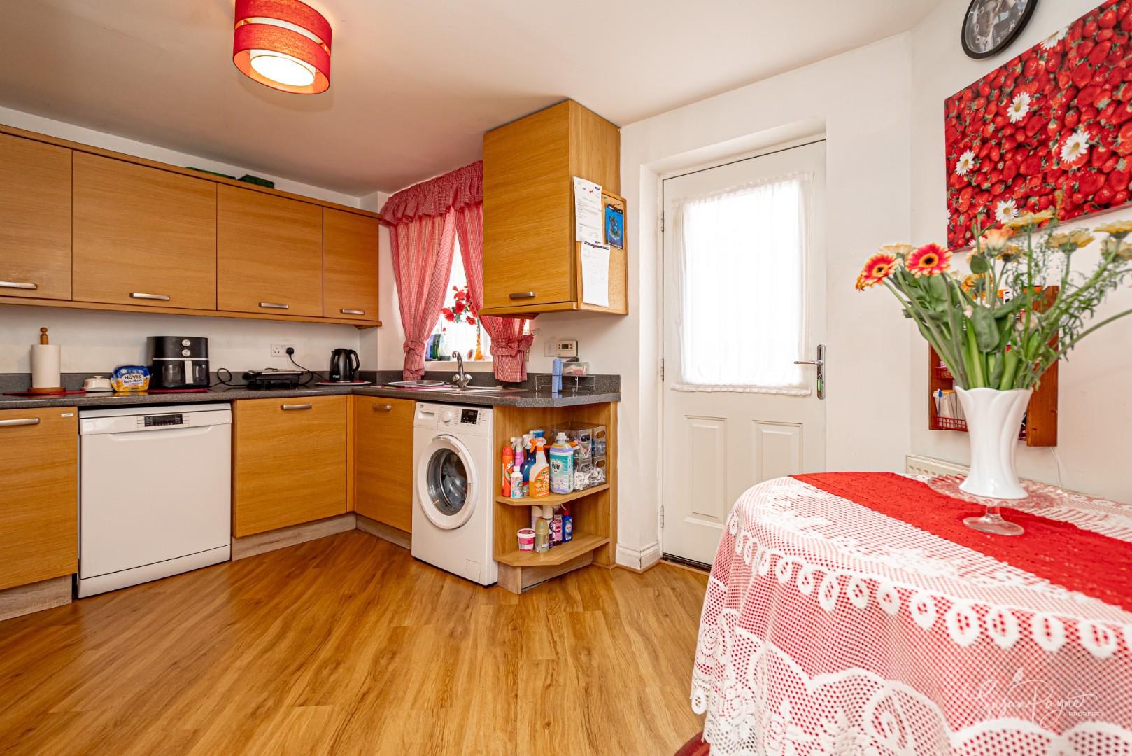 Continuing the flooring from the entrance hall is this modern kitchen benefitting from a partially glazed door to the rear garden. Fitted with wood-effect base and wall cabinets plus a granite effect worktop with a matching upstand, this kitchen provides under-counter space for two appliances including plumbing for a washing machine and a separate dishwasher. The worktop integrates an electric oven with a gas hob and a cooker hood over, plus a stainless steel 1.5 sink and drainer beneath a window to the rear. The kitchen offers ample space for a large fridge freezer plus additional storage space underneath the stairs. A pendant light fitting is also located here.