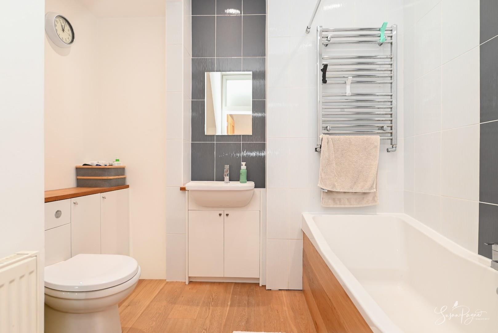 Making the best use of space, this lovely family bathroom offers a shower over bath, a vanity hand basin, and a unit incorporating a WC. The room is finished with neutral tiling around the suite, a chrome heated towel rail to keep the room cosy, and access to an understairs storage cupboard.