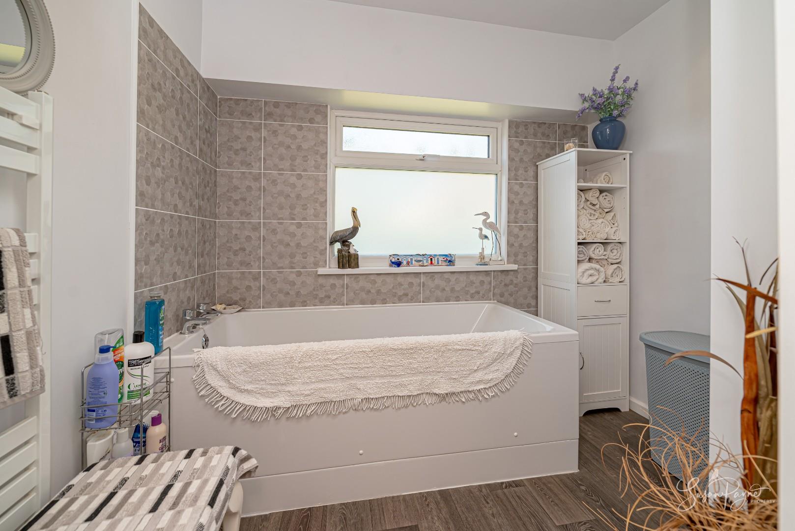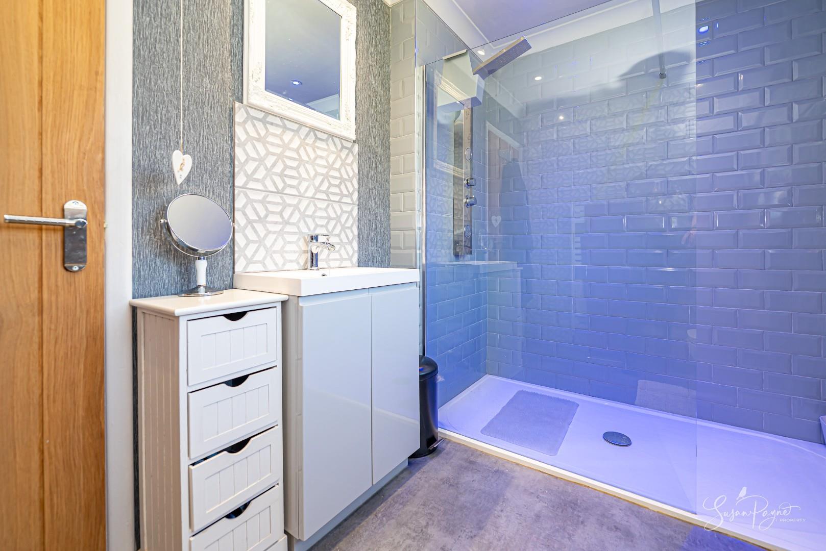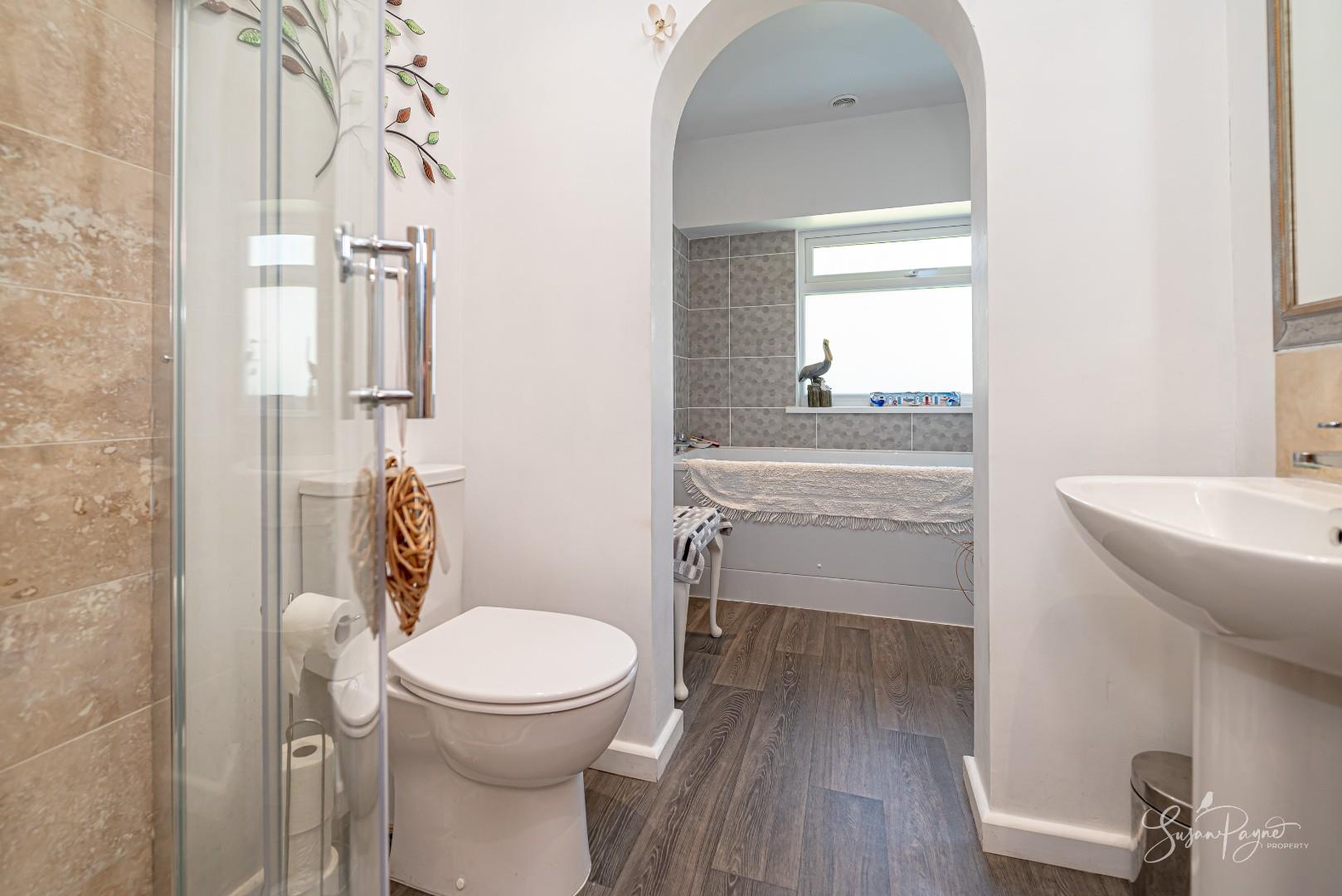 Serving the remaining bedrooms, the bathroom is well-positioned and fitted with a corner shower, substantial bath, and modern sanitary ware, completing the internal accommodation.