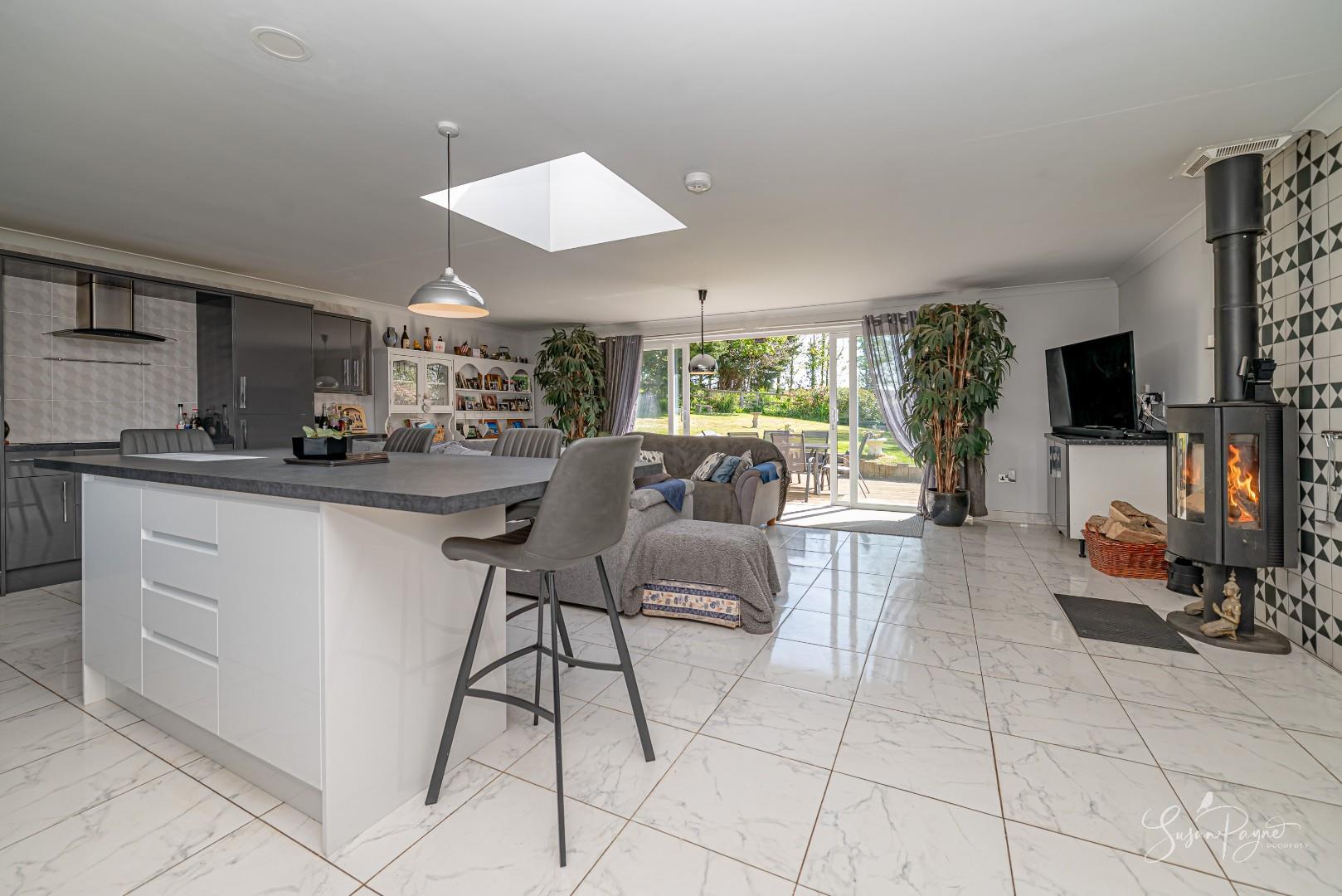 Woodlands is an exceptionally well-proportioned detached bungalow, offering an impressive balance of space, light and versatility throughout its large footprint. The property has been upgraded, updated and maintained to a very high standard throughout, and is thoughtfully arranged to create a natural flow between living and sleeping accommodation, with a particular emphasis on open-plan living at its core. The open-plan kitchen/living area and adjacent dining area forms a sociable and welcoming hub, ideal for both everyday living and entertaining. Externally, the home is equally appealing, set within established and beautifully maintained grounds that provide both privacy and a picturesque setting. With the added benefits of a generous loft space that could offer further potential (subject to any necessary consents), a detached garage complete with workshop space, and ample private parking, Woodlands represents a complete and highly adaptable home.