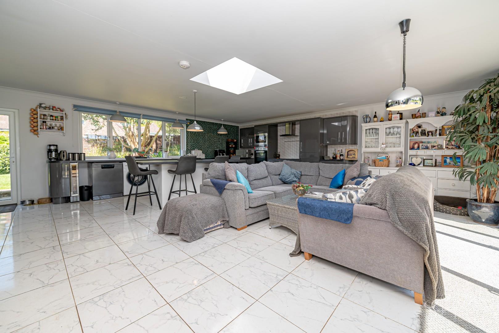 Undoubtedly the standout feature of the home, the open-plan kitchen and living area is a superb, light-filled space designed for modern living. The kitchen is fitted with sleek, contemporary units, integrated appliances and generous work surfaces, complemented by a large central island that doubles as a breakfast bar. The space flows effortlessly into the lounge area, where comfortable seating is arranged to enjoy views over the garden through wide sliding doors. A centrally positioned rooflight enhances the sense of space, while a stylish log-burning stove introduces warmth and a focal point during cooler months. This is a room that works equally well for everyday family life and entertaining on a larger scale. Bifold doors provide access to the dining area.