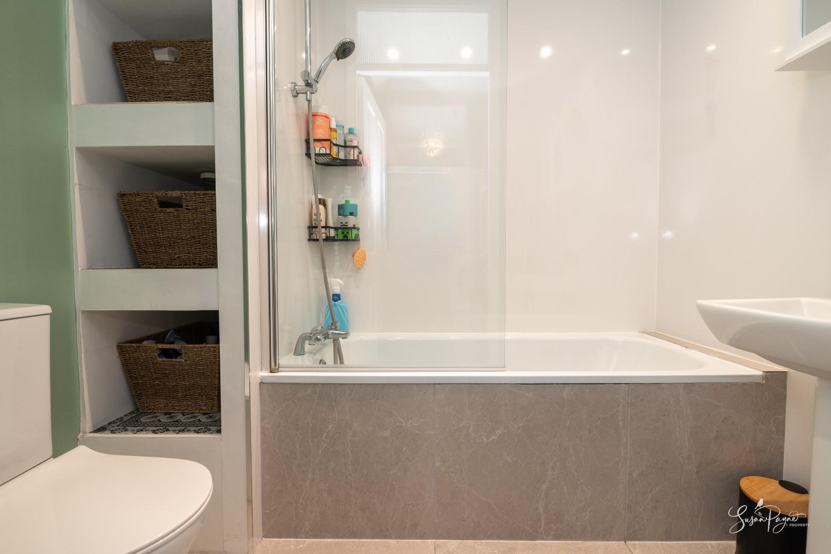 Recently updated, this family bathroom comprises a bath and shower over, a hand basin and WC. The space is finished with a large heated towel rail and an extractor fan.
