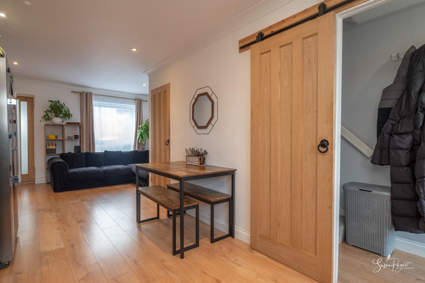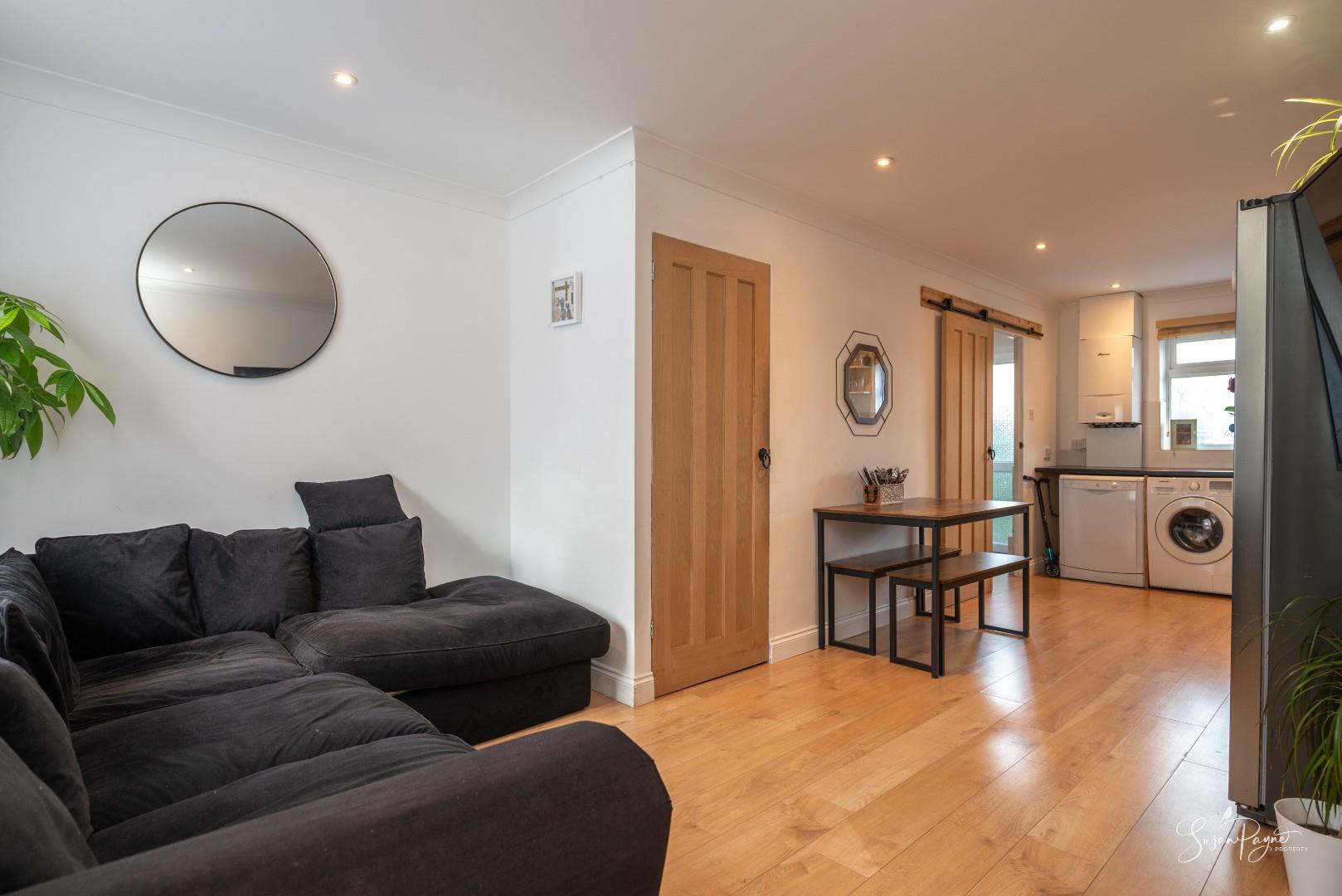 Filled with natural light from a window to the front aspect, the living room offers comfortable proportions for both relaxation and entertaining. Neutral finishes and warm flooring create an inviting atmosphere, while useful under-stair storage enhances practicality. The space flows seamlessly towards the kitchen at the rear, maintaining a sociable and connected feel throughout the ground floor.