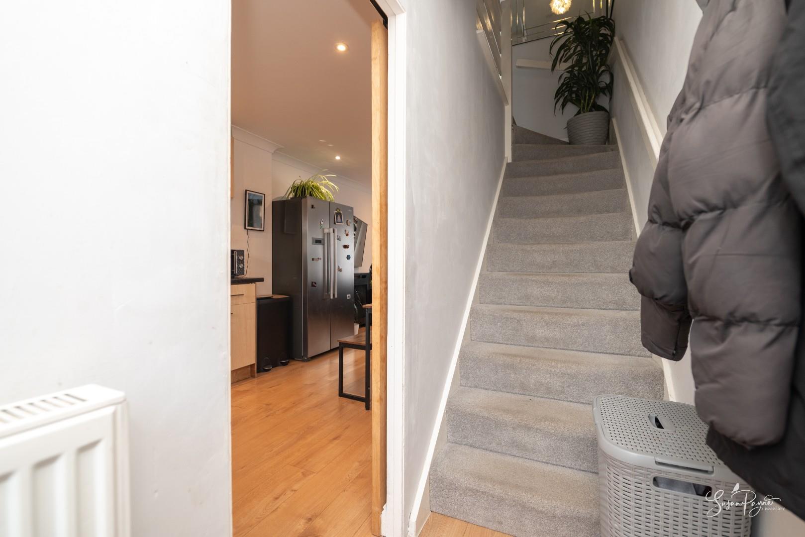 A glazed door provides direct access to the garden, plus access to the first-floor landing.