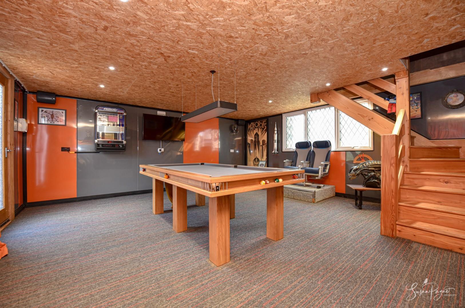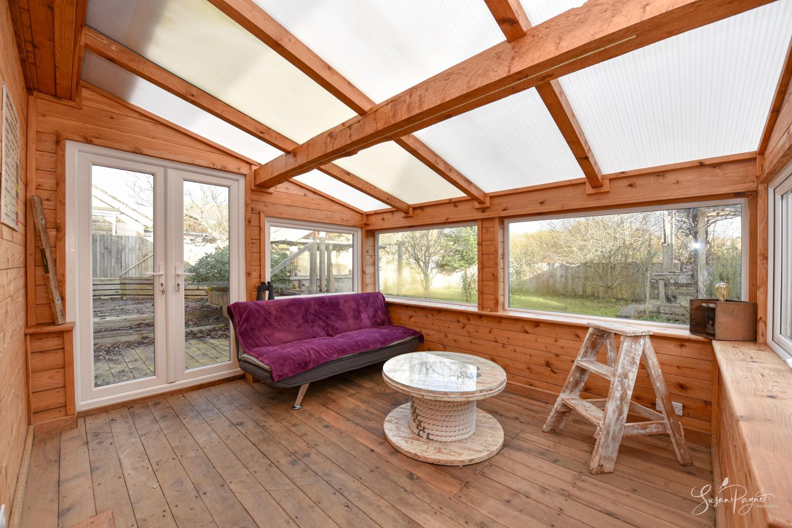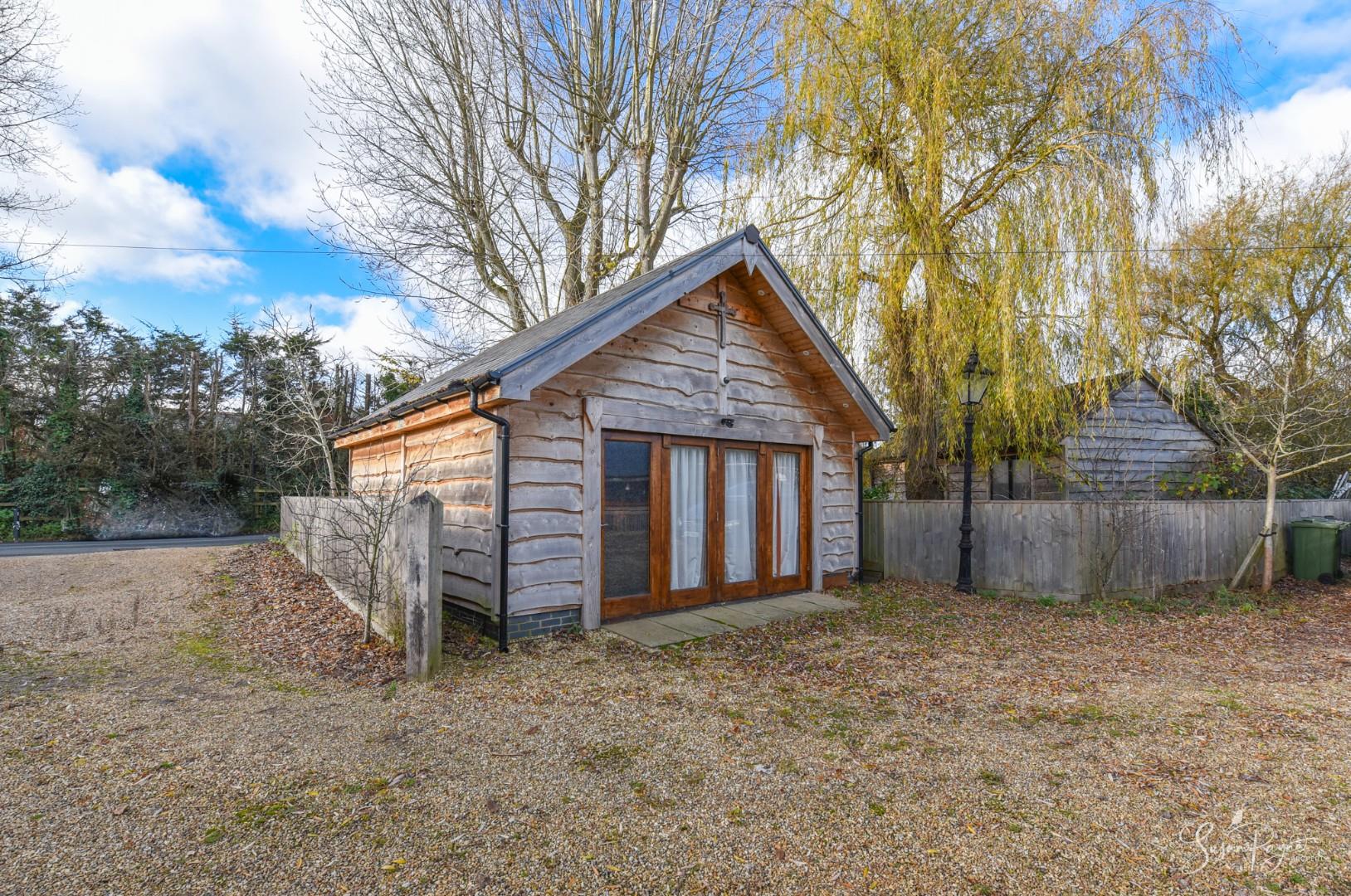 With oak-framed, glazed bi-fold doors spanning the front elevation, this large timber-framed building is finished with cedar cladding and a slate roof. Benefitting from electricity and lighting, this space has a room on each floor with the ground floor measuring 18'06 x 18'0 and the first floor attic room measuring 18’06 x 8’0. Set up as a fantastic family games room, the ground floor is carpeted and has panelled walls, a window to the rear, plus a wooden staircase to the versatile attic room with a Velux window. Additionally, there is an enclosed garden to the rear.