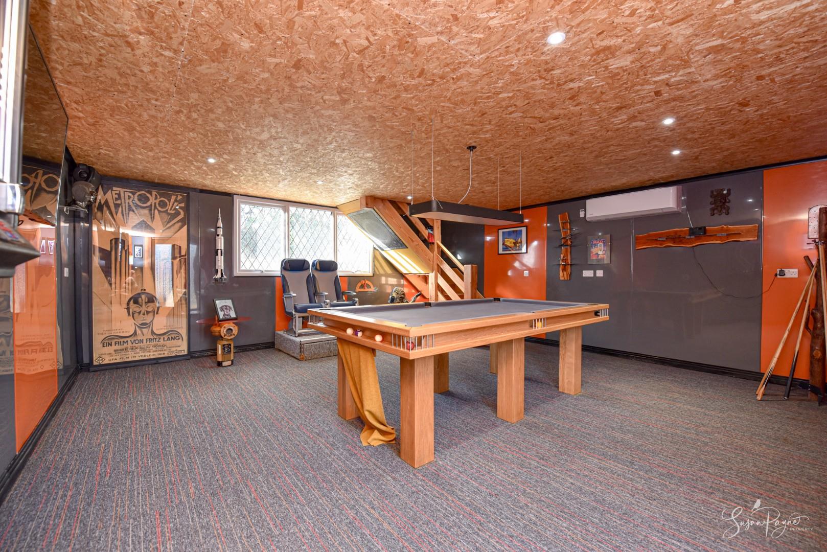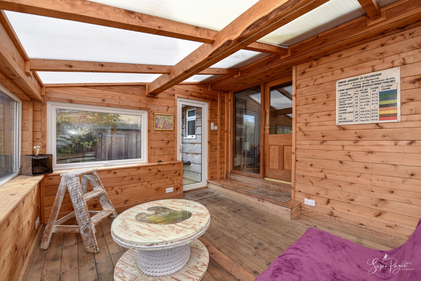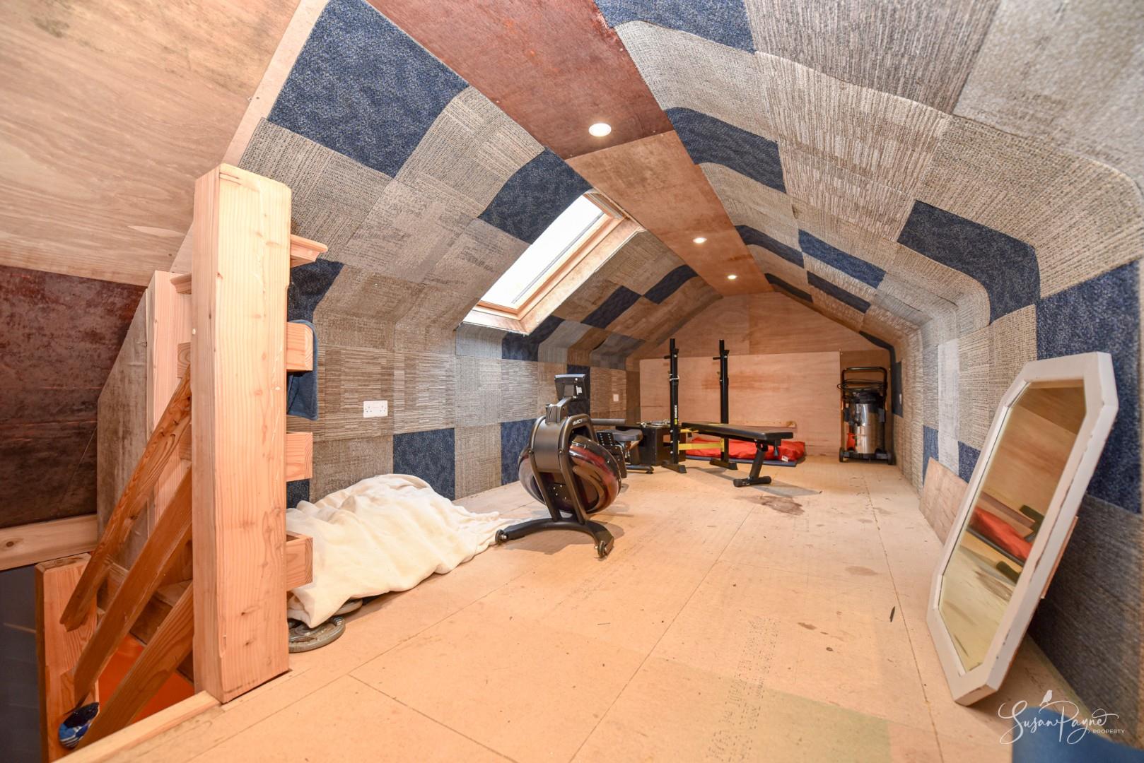 With oak-framed, glazed bi-fold doors spanning the front elevation, this large timber-framed building is finished with cedar cladding and a slate roof. Benefitting from electricity and lighting, this space has a room on each floor with the ground floor measuring 18'06 x 18'0 and the first floor attic room measuring 18’06 x 8’0. Set up as a fantastic family games room, the ground floor is carpeted and has panelled walls, a window to the rear, plus a wooden staircase to the versatile attic room with a Velux window. Additionally, there is an enclosed garden to the rear.