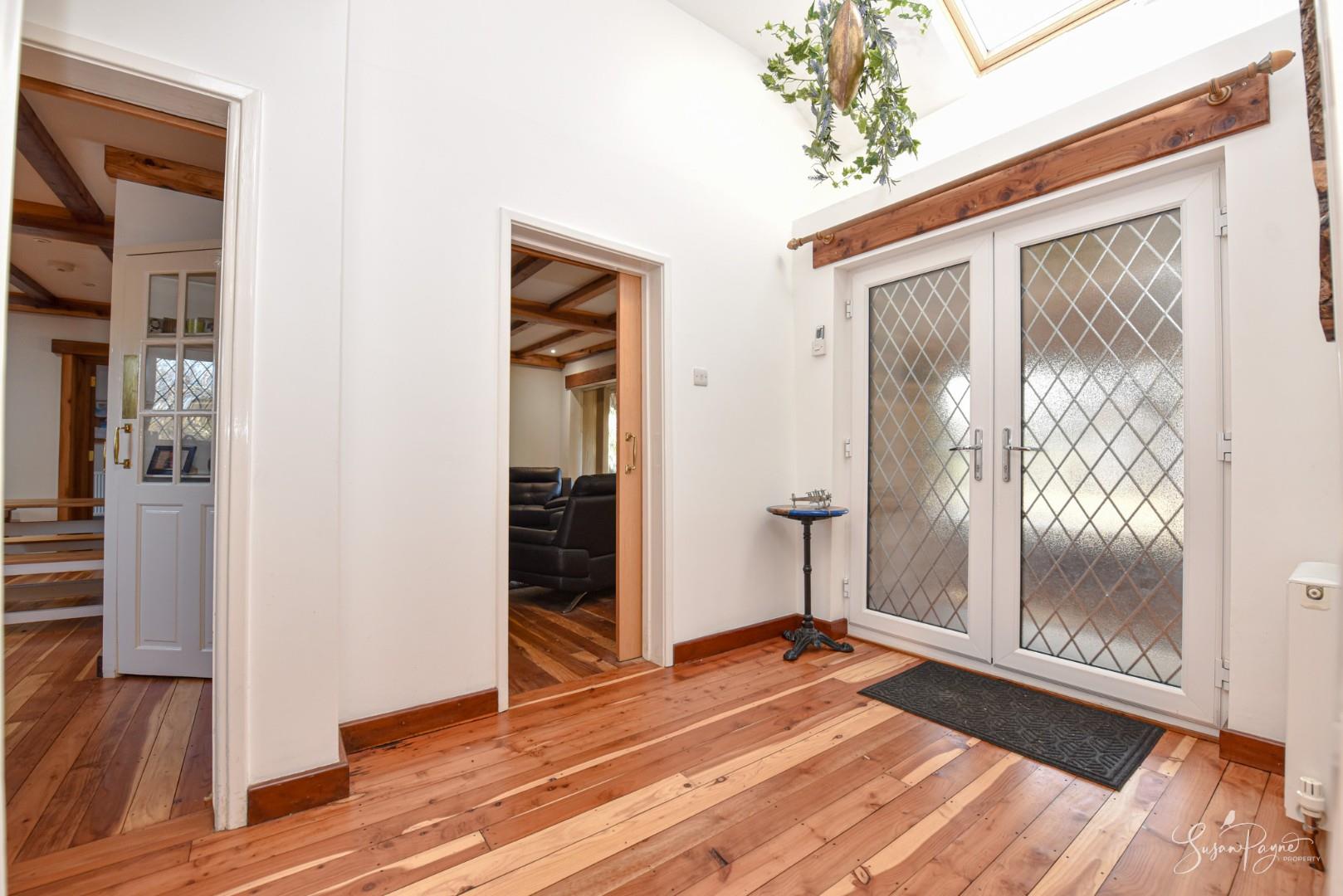 Bathed in natural light, this space features a high ceiling with a Velux window, a handy cloak cupboard, and a series of timber doors leading to the kitchen-diner, sitting room, two bedrooms and shower room.