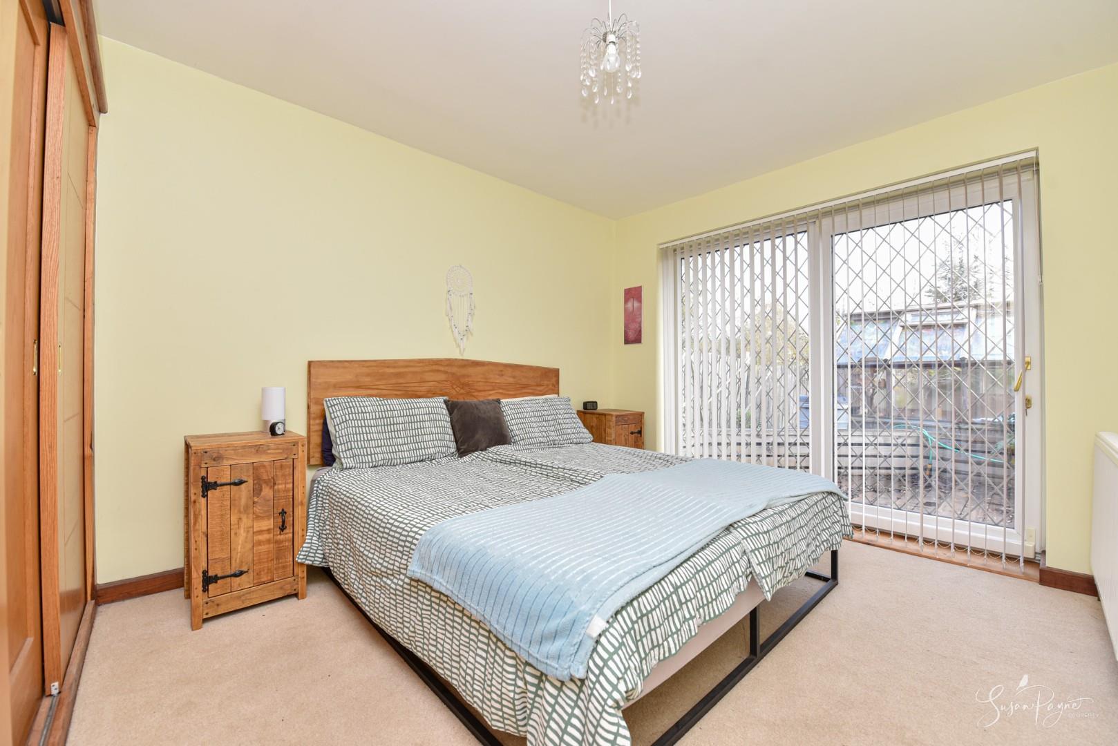 Providing a carpeted, double-sized bedroom fitted with large timber wardrobes and sliding, glazed doors which open to a decked terrace and the rear garden beyond.