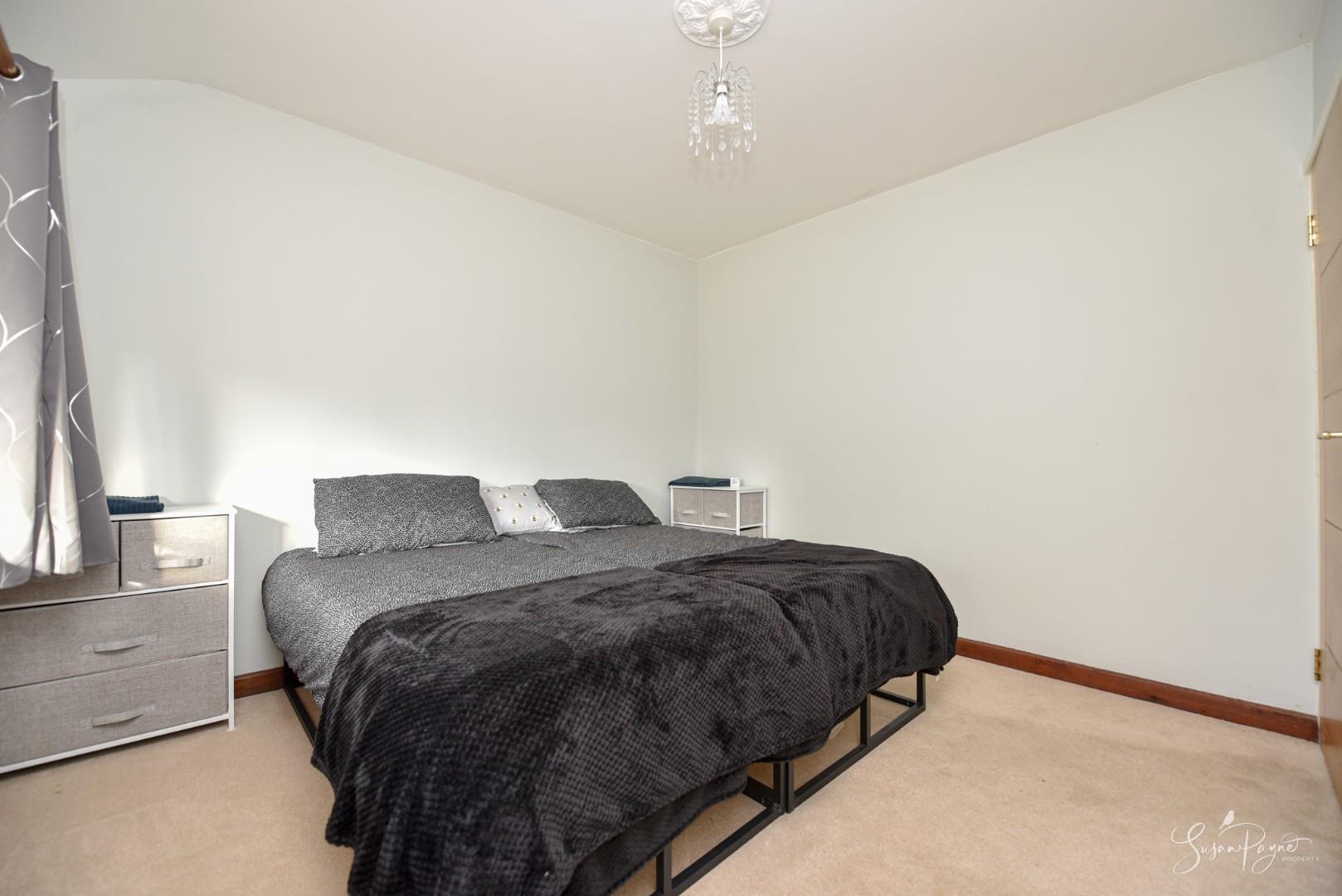 An additional double bedroom with a carpet and a large window to the front elevation.