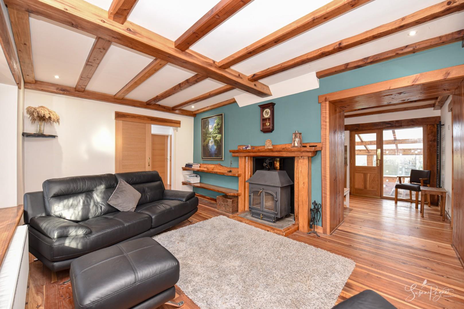 This inviting room is full of character with timber ceiling beams and a substantial log burner mounted on a stone hearth with a solid timber mantle and shelving to one side. There is a large window to the front elevation and a wide open doorway to the kitchen-diner.