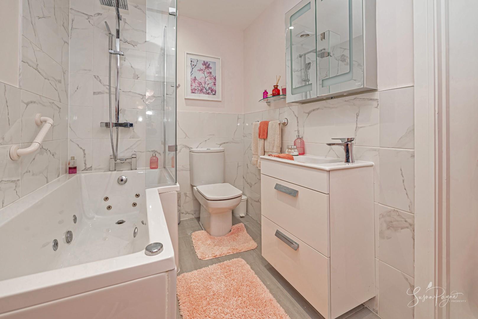 The family bathroom is elegantly appointed with a modern suite including luxurious whirlpool bath, basin and WC, complemented by stylish tiling and contemporary fittings.