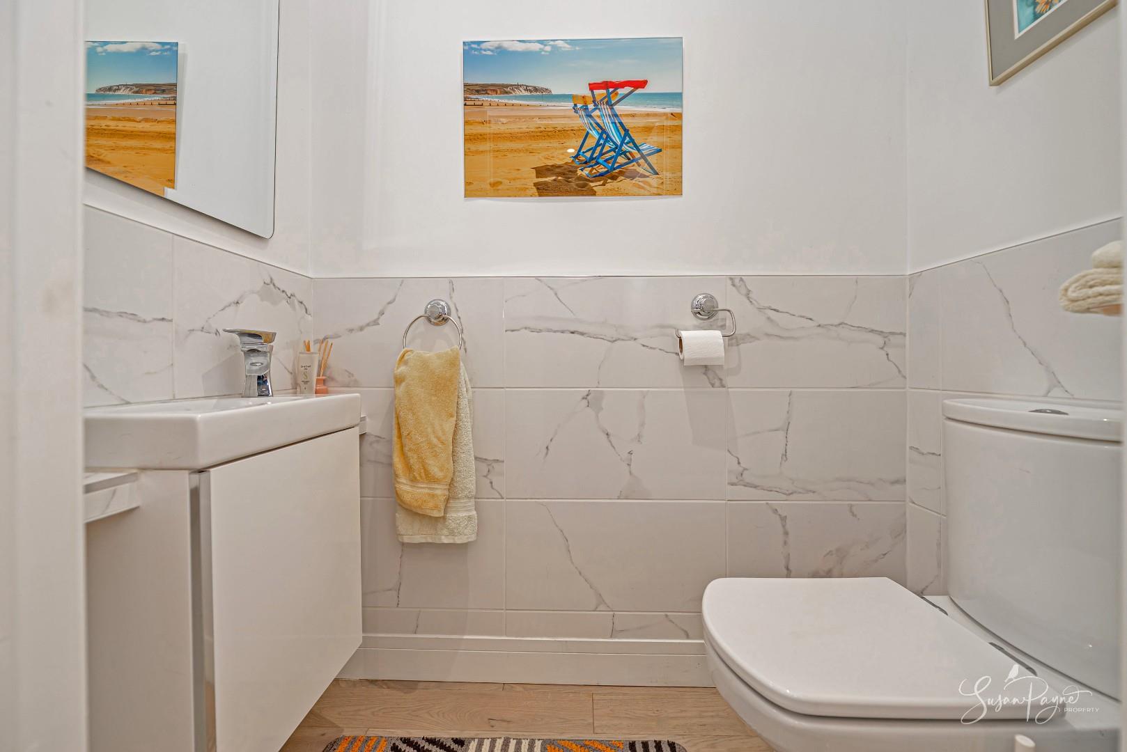 Conveniently positioned and well-appointed, the useful separate cloakroom features a WC and compact wash-basin and is finished with elegant wall tiles to dado height.