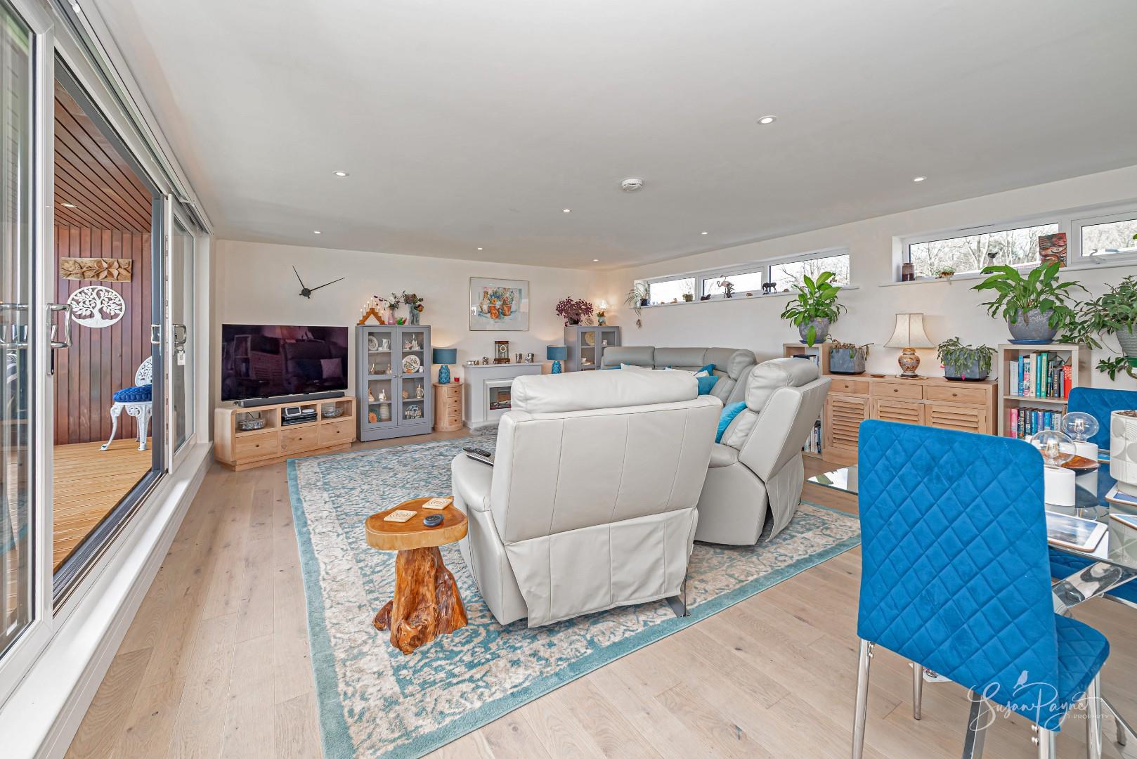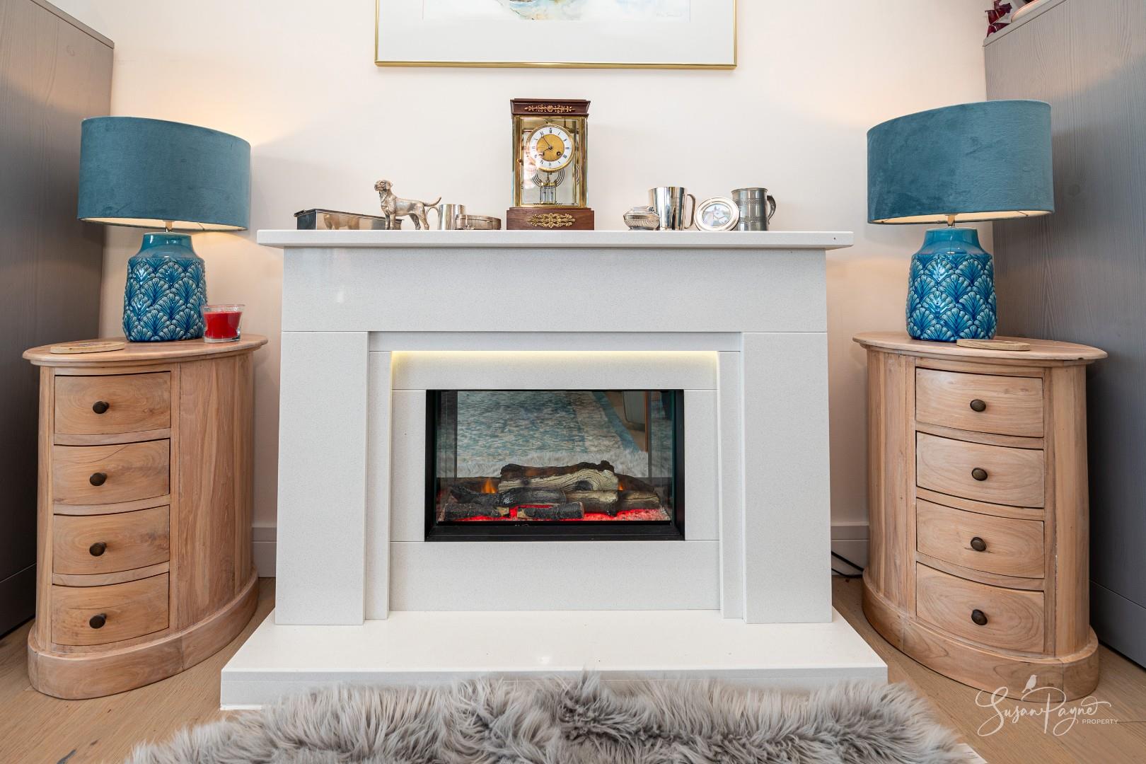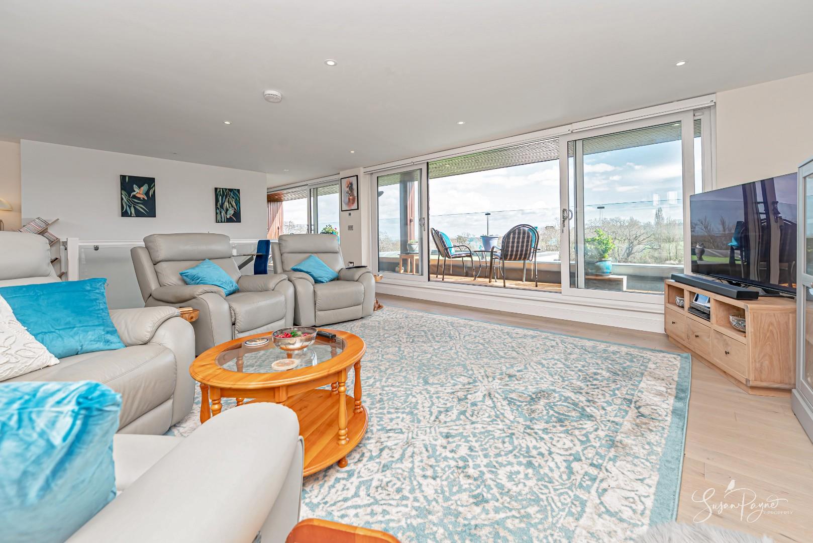 The expansive lounge area is flooded with natural light, with sliding doors leading on to the upper balcony and providing a wonderful outlook. The lounge area also benefits from a stylish electric fire to one wall.