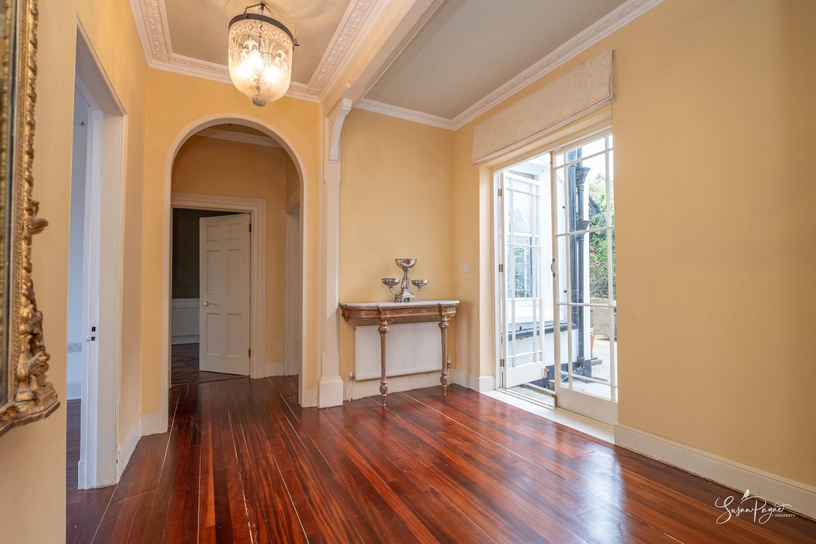 Dating from 1809, Pennyroyal is a distinguished Grade II listed marine villa built for Major General Phillip Harris of the Royal Navy, just three years after the Battle of Trafalgar. Set within mature gardens and enjoying elevated views towards the Solent, the property offers a rare combination of historical character, generous accommodation and coastal proximity. Over more than two centuries the house has retained a remarkable collection of original architectural features, including polished wooden flooring, decorative cornicing, period doors, fireplaces and traditional architraves. These details sit comfortably alongside carefully maintained interiors, creating a home that feels both elegant and welcoming.
