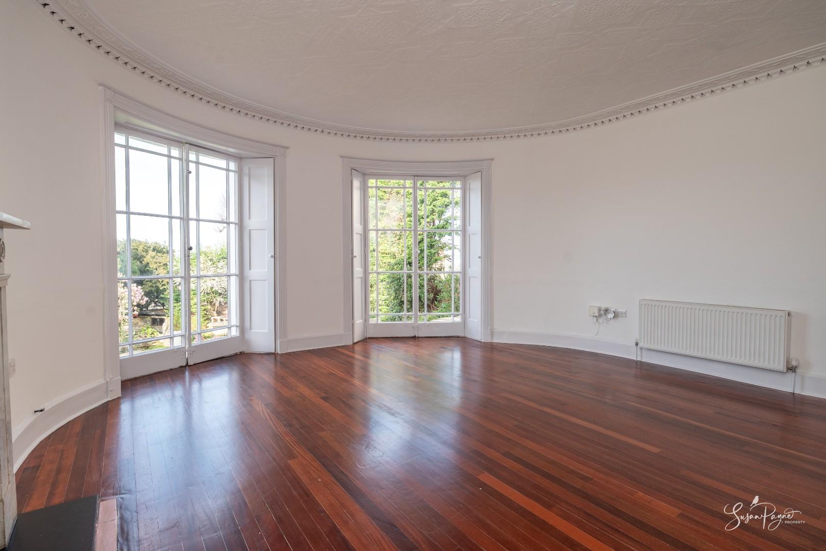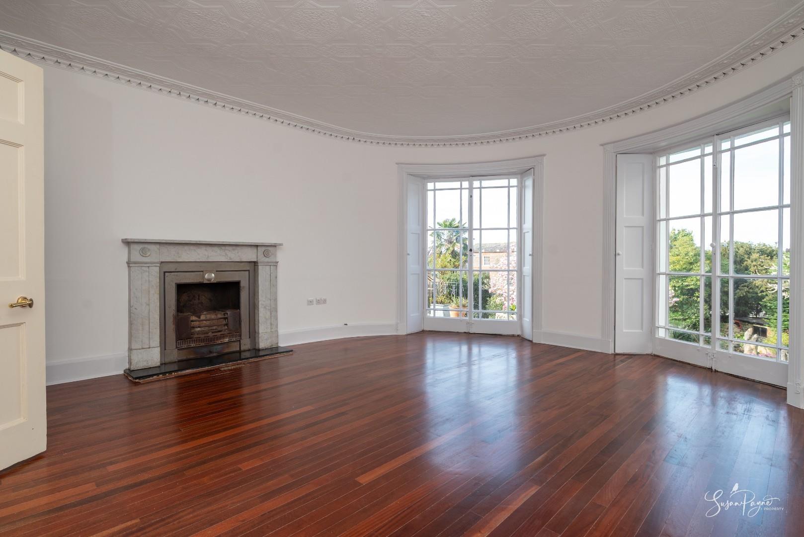 Generous in proportion and beautifully light, the main sitting room enjoys a graceful bow frontage with French doors opening onto the elevated terrace. A marble fireplace provides a refined focal point while tall windows frame garden views and glimpses towards the Solent.