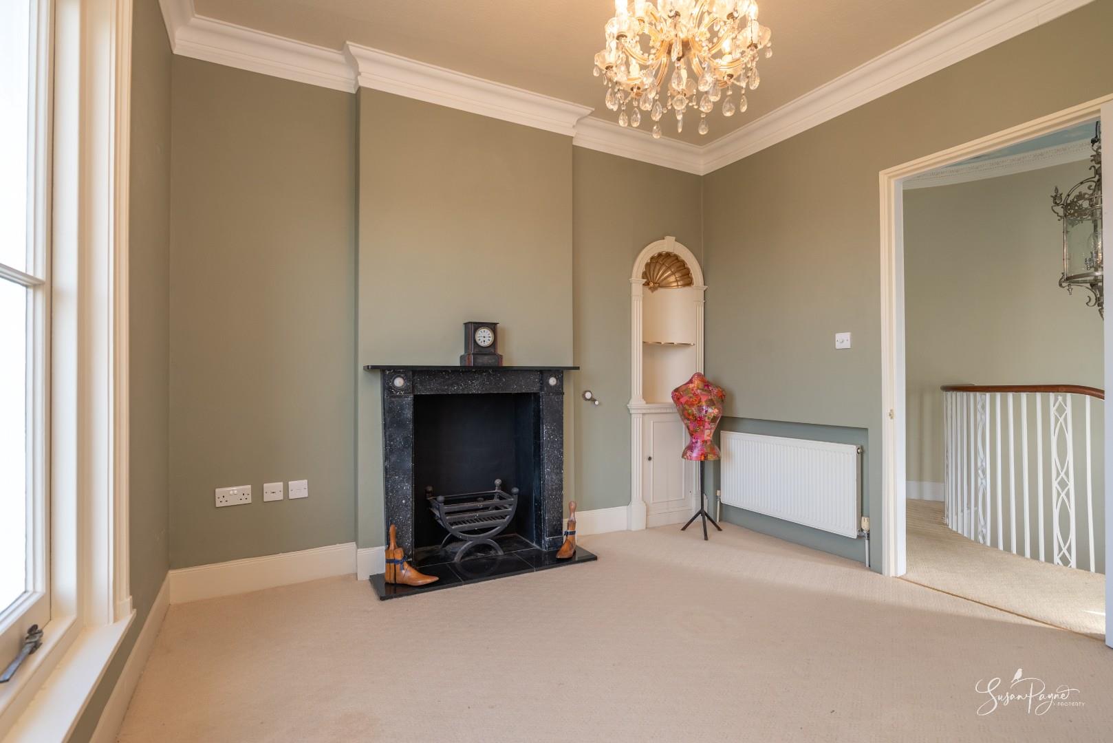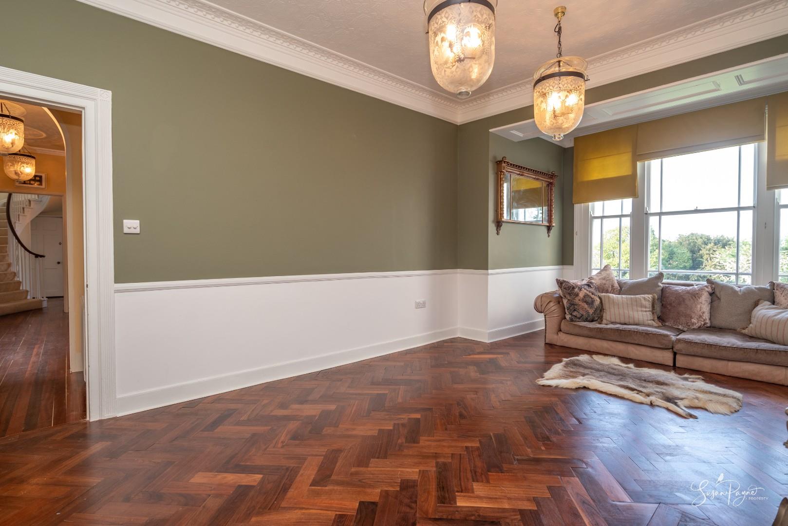 Positioned for both everyday use and entertaining, the dining room offers a comfortable yet elegant setting with high ceilings and a characterful fireplace surround. Natural light from tall sash windows enhances the sense of space whilst boasting stunning parquet flooring. Historically, a chest was believed to have been buried beneath the floor of the dining room where historical tenants had kept their valuables.