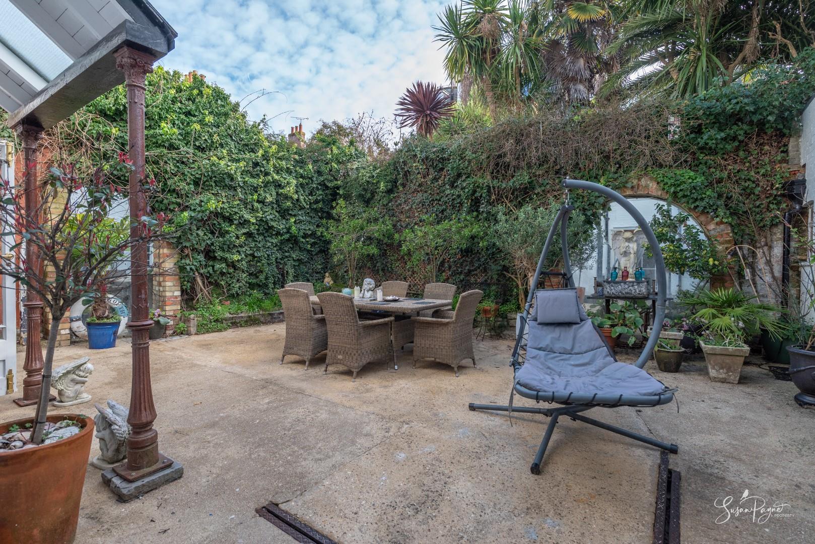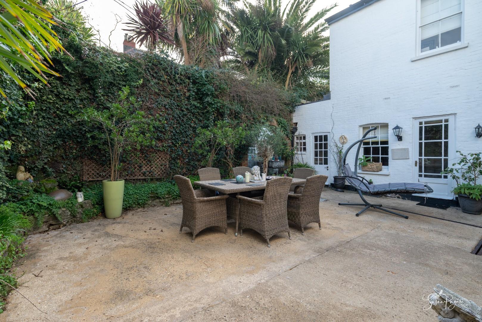To the rear, a secluded courtyard offers a sheltered space for relaxed entertaining, thoughtfully arranged with planting and seating areas that complement the home’s character. The original hand pump is still featured in this space as well as additions have been made, including the addition of an open porch using original parts from Ryde Pier.