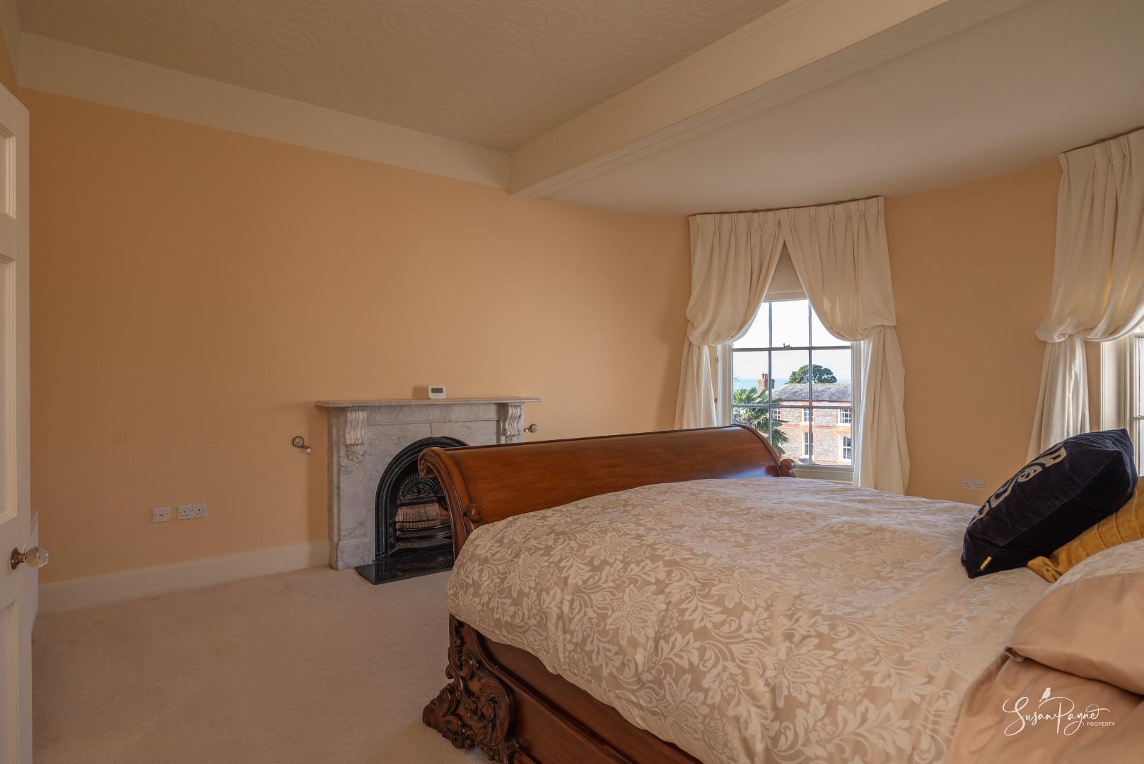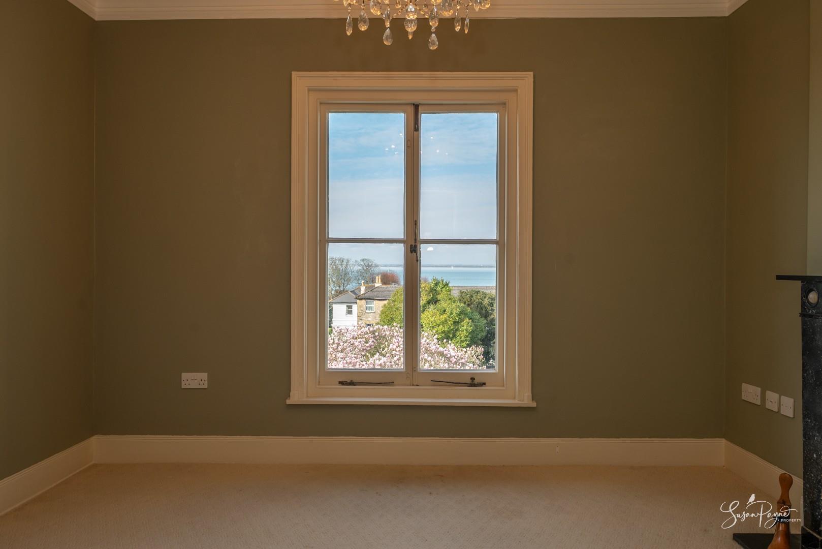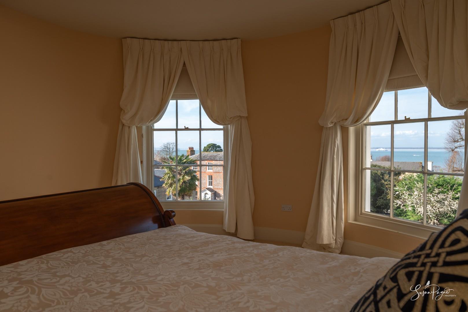 Bathed in natural light from elegant bow windows, the principal bedroom enjoys elevated views across the gardens towards the Solent. The room’s proportions create a calm and restful atmosphere befitting the home’s historic character.
