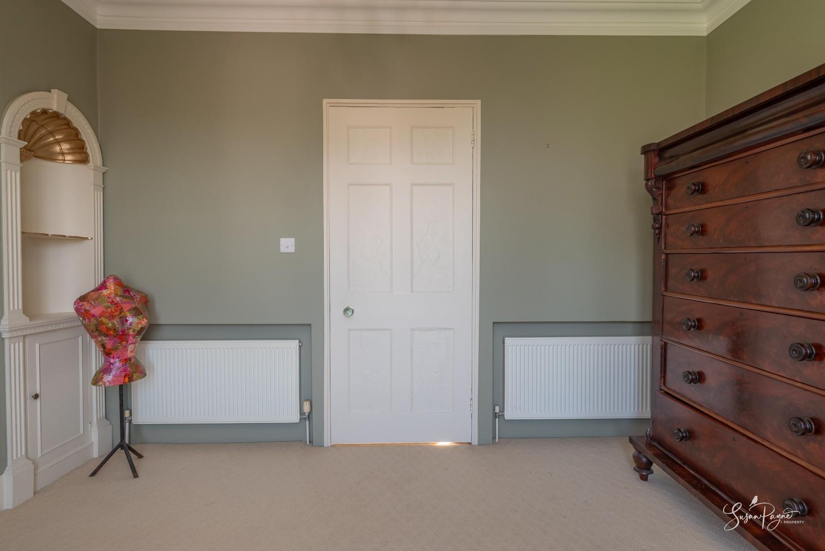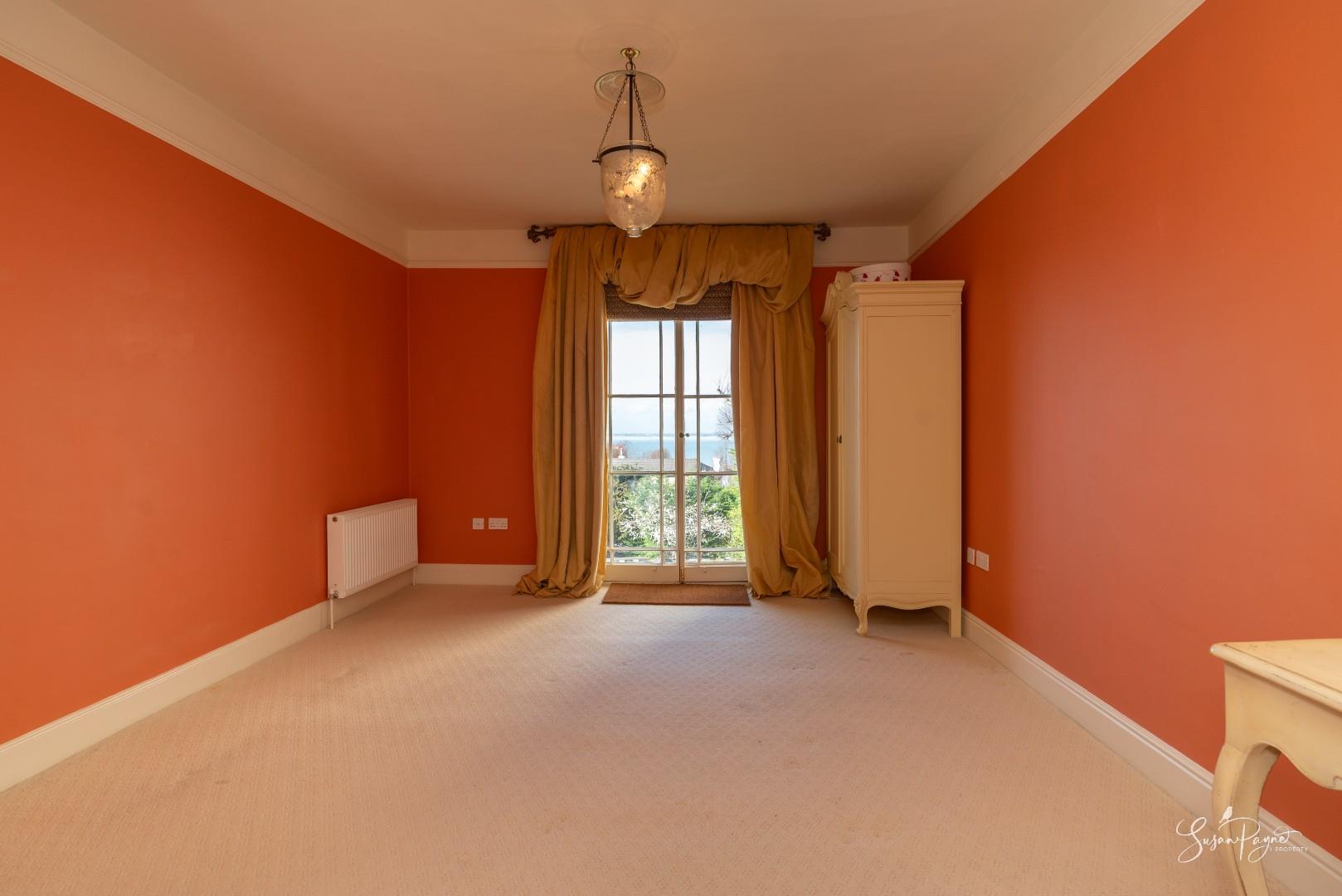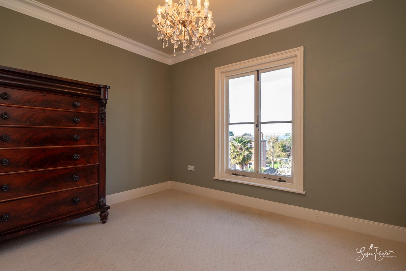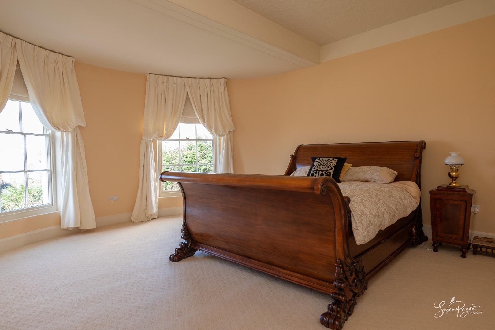 Bathed in natural light from elegant bow windows, the principal bedroom enjoys elevated views across the gardens towards the Solent. The room’s proportions create a calm and restful atmosphere befitting the home’s historic character.