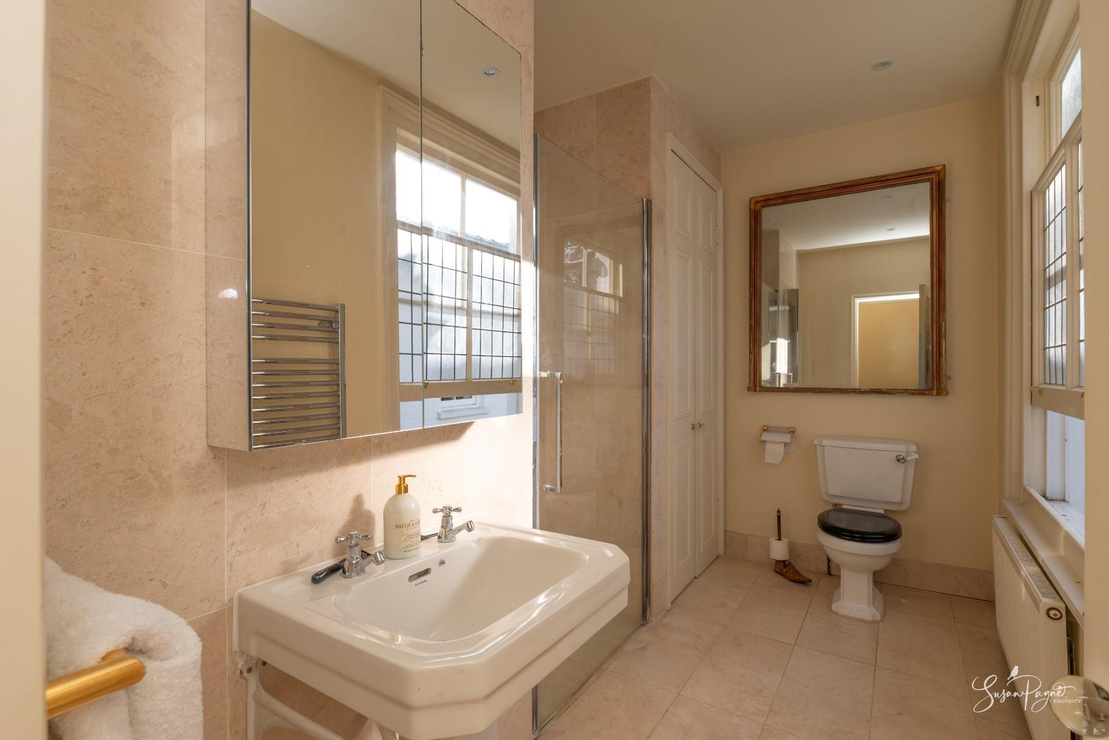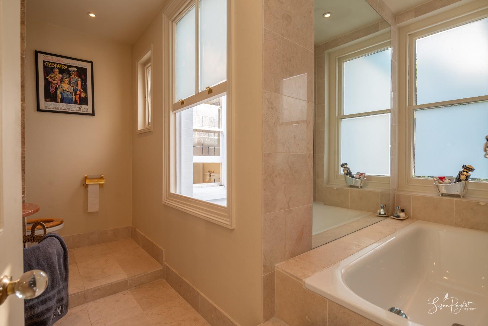 Neutrally finished, this characterful family bathroom comprises a hand basin, a WC and an alcove fitted with a sunken bathtub. The three obscure glazed windows to the rear aspect fill the space with natural light.