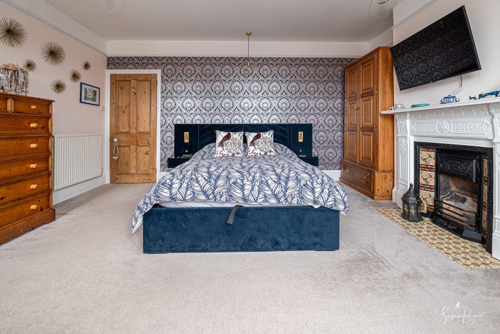 A grand primary bedroom with bay and side windows, deep skirtings and a picture rail. There is a cast fireplace with a fabulous surround, decorative tiling and hearth, and opulent patterned wallpaper to two walls which is complemented by neutral tones and a neutral carpet.