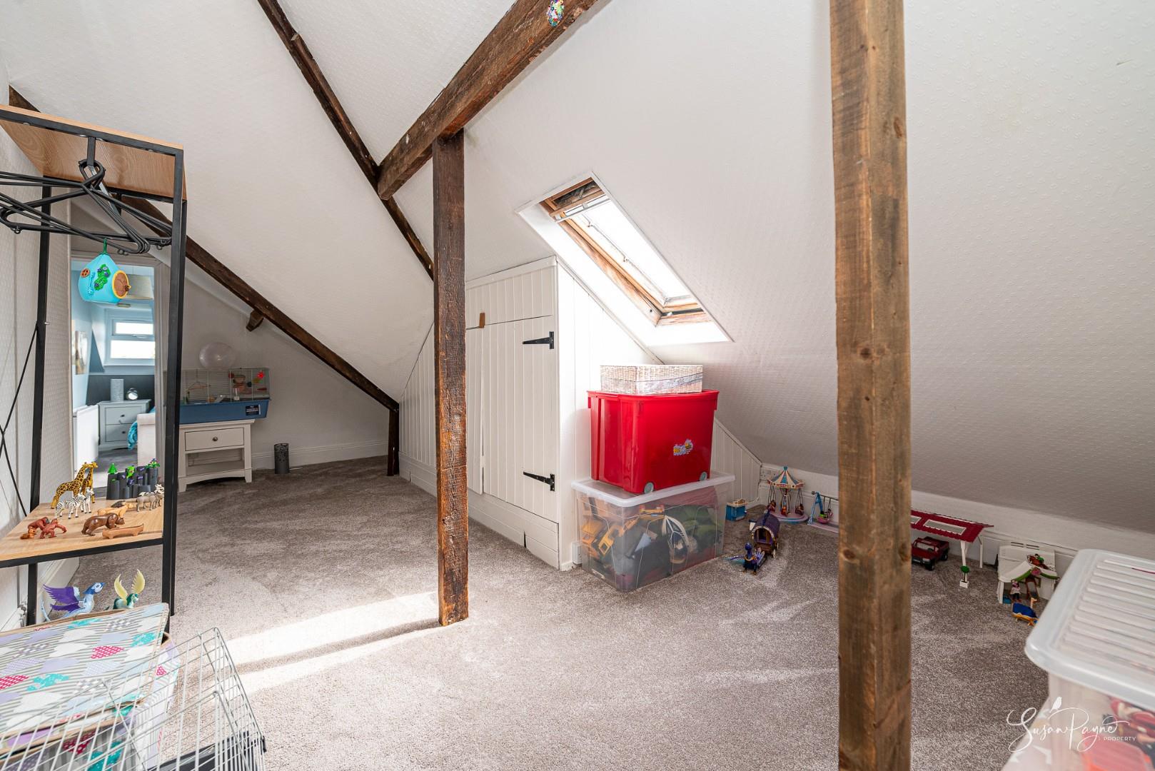 Accessed via a full staircase, which continues the home’s period charm, the converted attic is another versatile space and has plenty of head height. The landing, which could be used as a room has exposed beams, built-in storage, a Velux window and is finished with white walls over a neutral carpet.