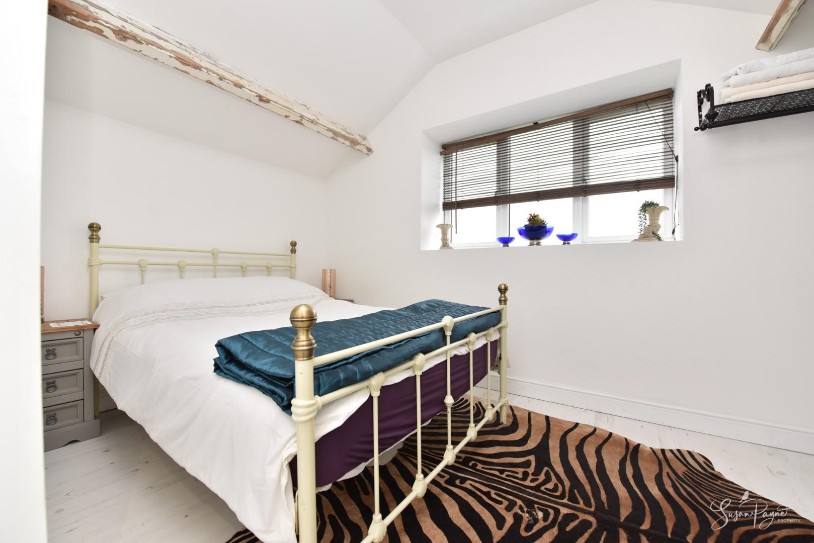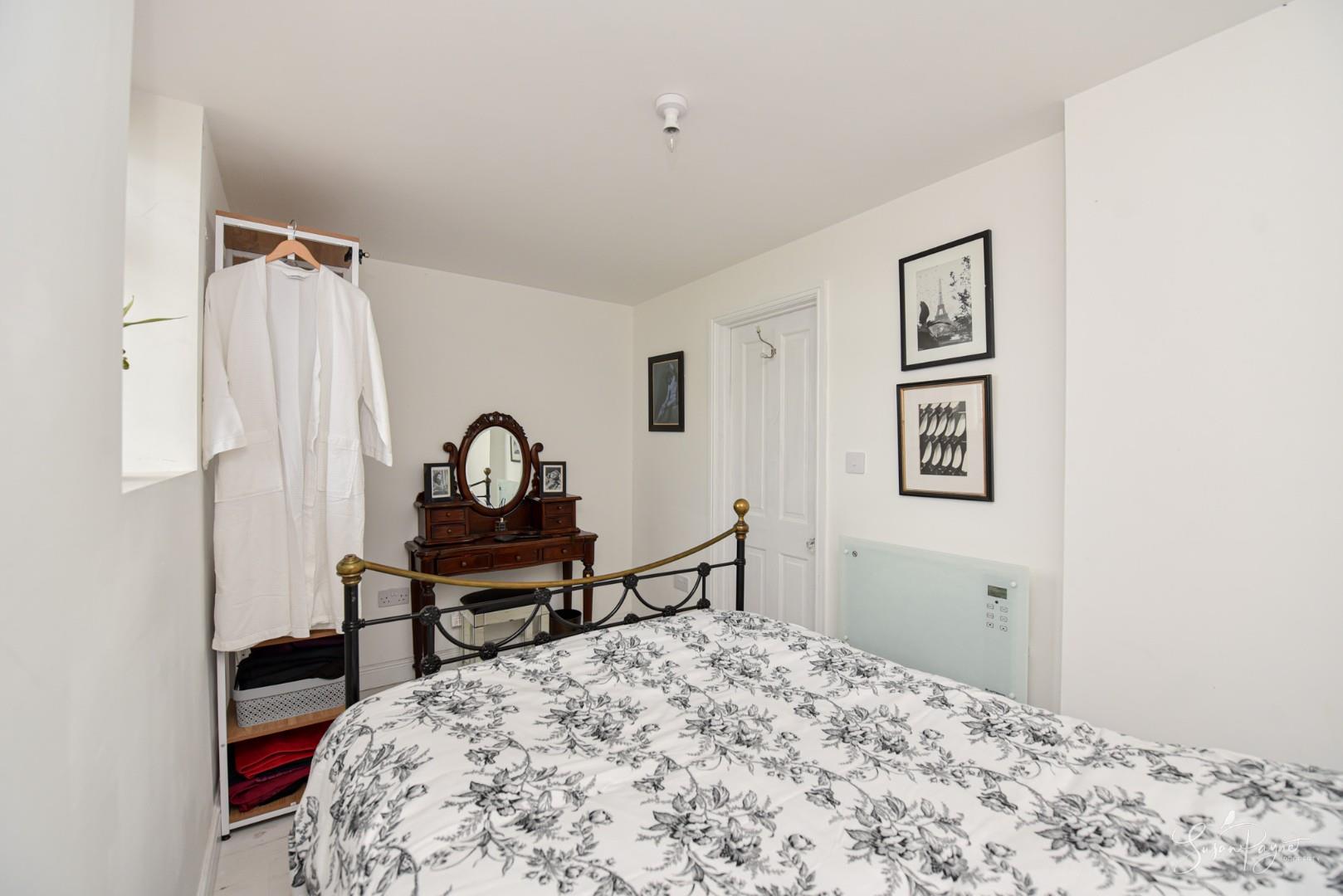Providing a sense of continuity, the decor within this immaculate double bedroom is identical to the clean white colour palette in the first-floor bedroom. A slim wall-mounted electric glass heater keeps the room cosy and there are exposed timber ceiling beams providing a touch of original character. Illuminated by a ceiling light fixture and a stylish wall fitted lampshade, the room also features a window to the rear aspect and a wall-mounted clothing rail with a shelf above.