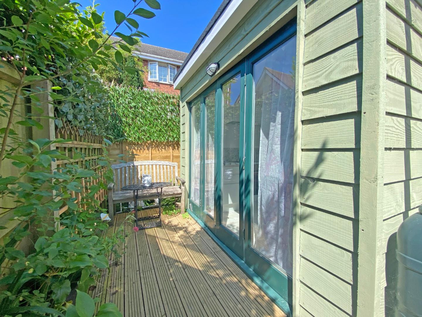 A delightful, fully enclosed outside space has been landscaped to offer a terraced design wrapping around from the rear to the side of the property with a decked and paved seating area to arrange outdoor furniture. In the back corner is a timber cladded gate which leads through to a fully enclosed space with the potential for a shed or bike storage. Providing vibrancy and interest, flourishing plant beds feature roses, hydrangeas and honeysuckle to elegantly climb an ornate metal arch which has a gate that opens to a gravel walkway to the side of the property. Also located here is an external socket point and lighting to provide nighttime illumination.