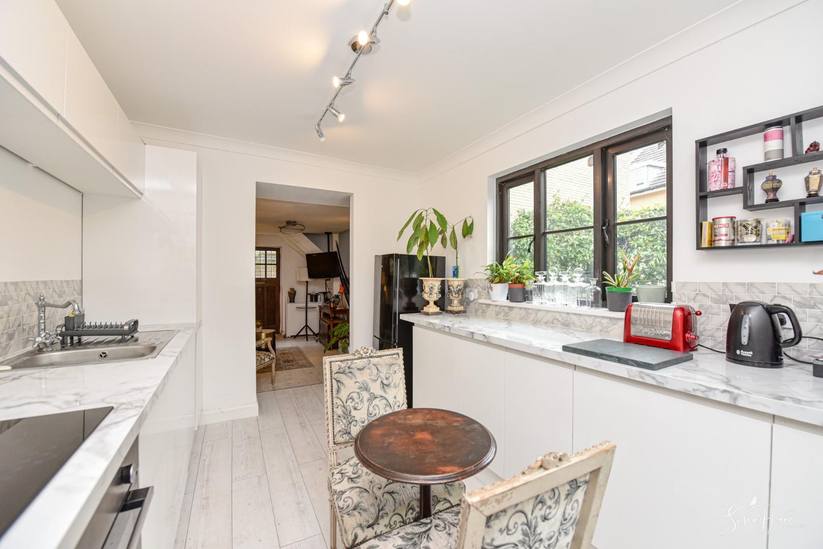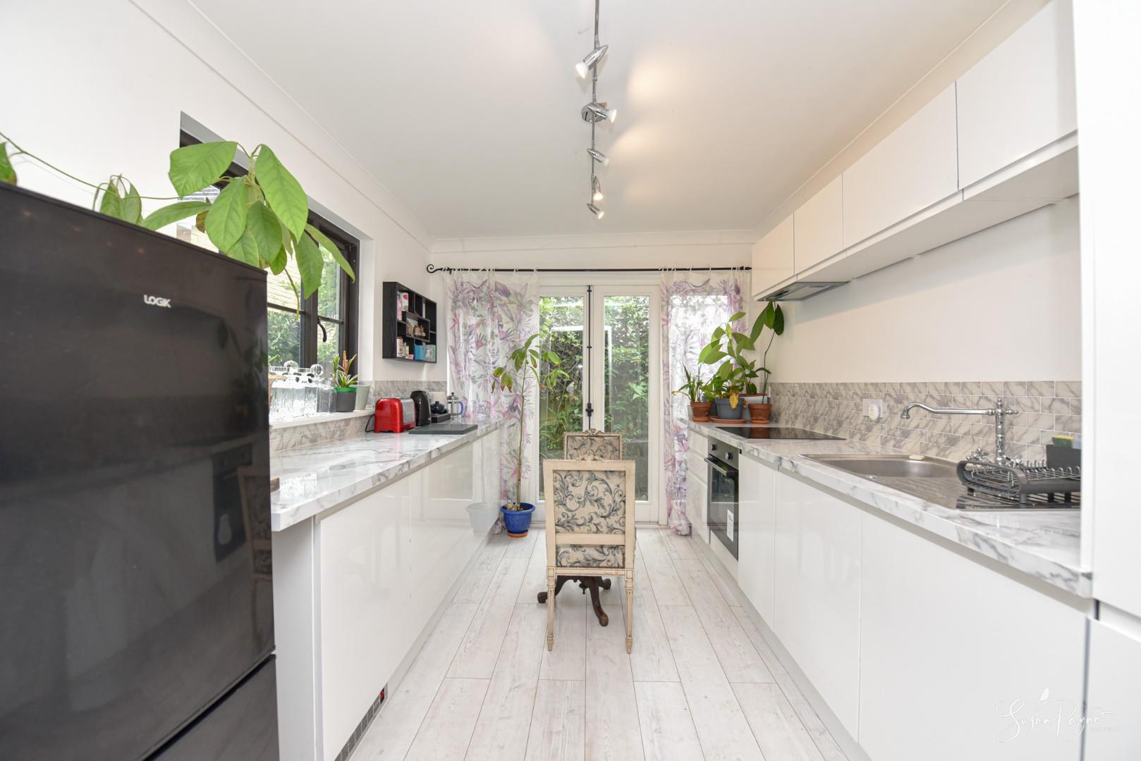 This elegant kitchen is fitted with a contemporary range of wall and base units with fresh white cupboard doors and drawer fronts with a sleek handleless design. A marble-effect splashback perfectly coordinates with the countertop which incorporates a stainless steel sink and drainer with a traditional-style mixer tap in chrome. Integrated appliances include a dishwasher and a washing machine, a duo dustbin caddy, an electric oven and a hob above which has a concealed extractor fan with lighting over. Warmed by a plinth-mounted fan heater, the room provides space to arrange a breakfast dining set and there is additional space at the end of the units to position a full-height appliance such as an American fridge-freezer. With a window to the side aspect, the room also features a set of French glazed doors which open to a decked terrace and allow for plenty of natural light. This beautiful kitchen is finished with a whitewash wood-effect laminate floor, crisp white painted walls and a modern spotlight bar in chrome to provide stylish illumination.