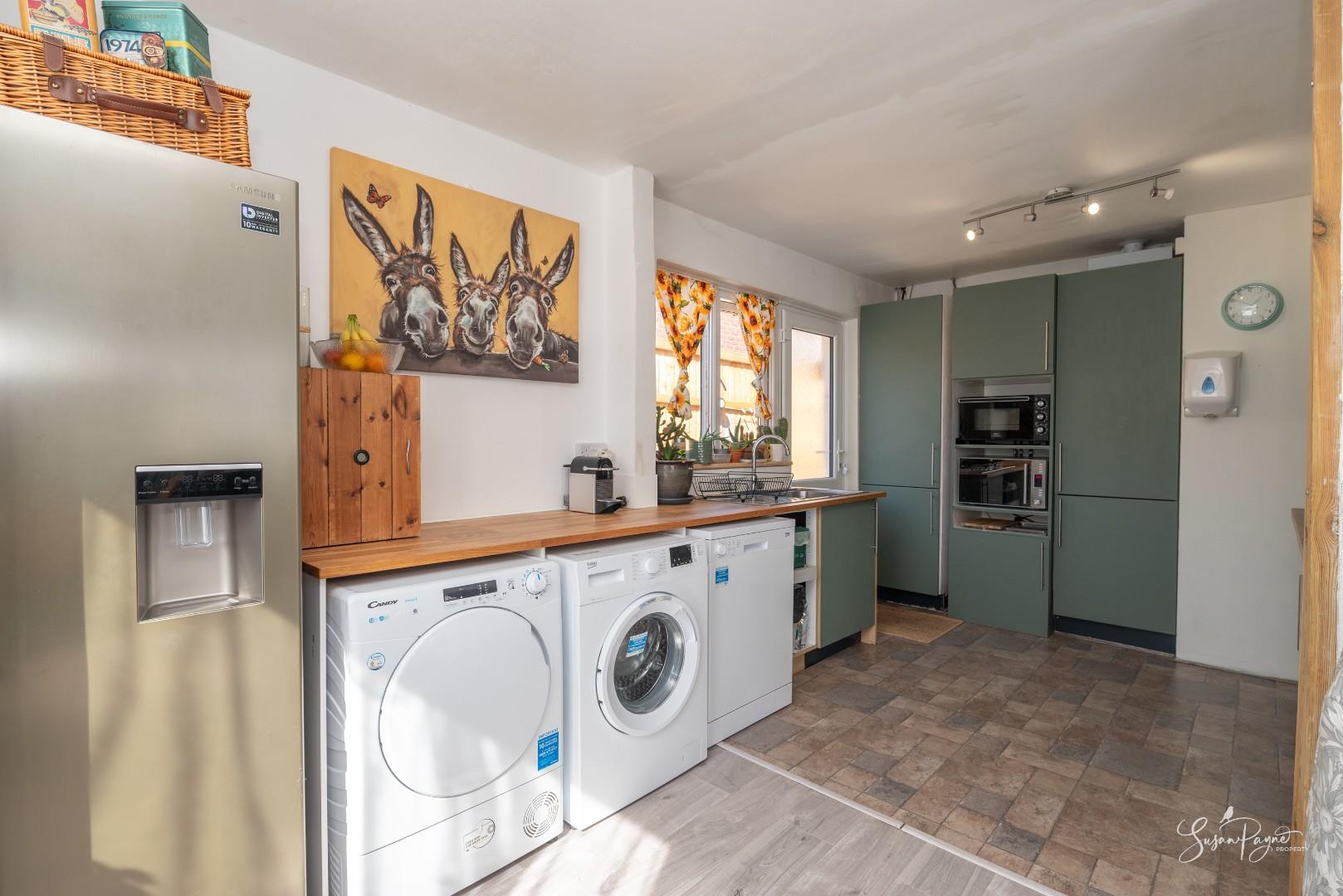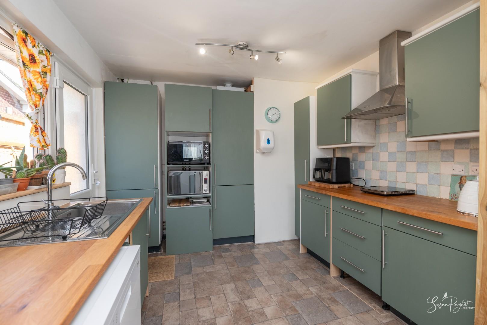 The kitchen is well arranged with a range of fitted units and generous worktop space, positioned to connect directly with the dining area, making it ideal for both everyday living and entertaining. A door leads out to the side path and garden.