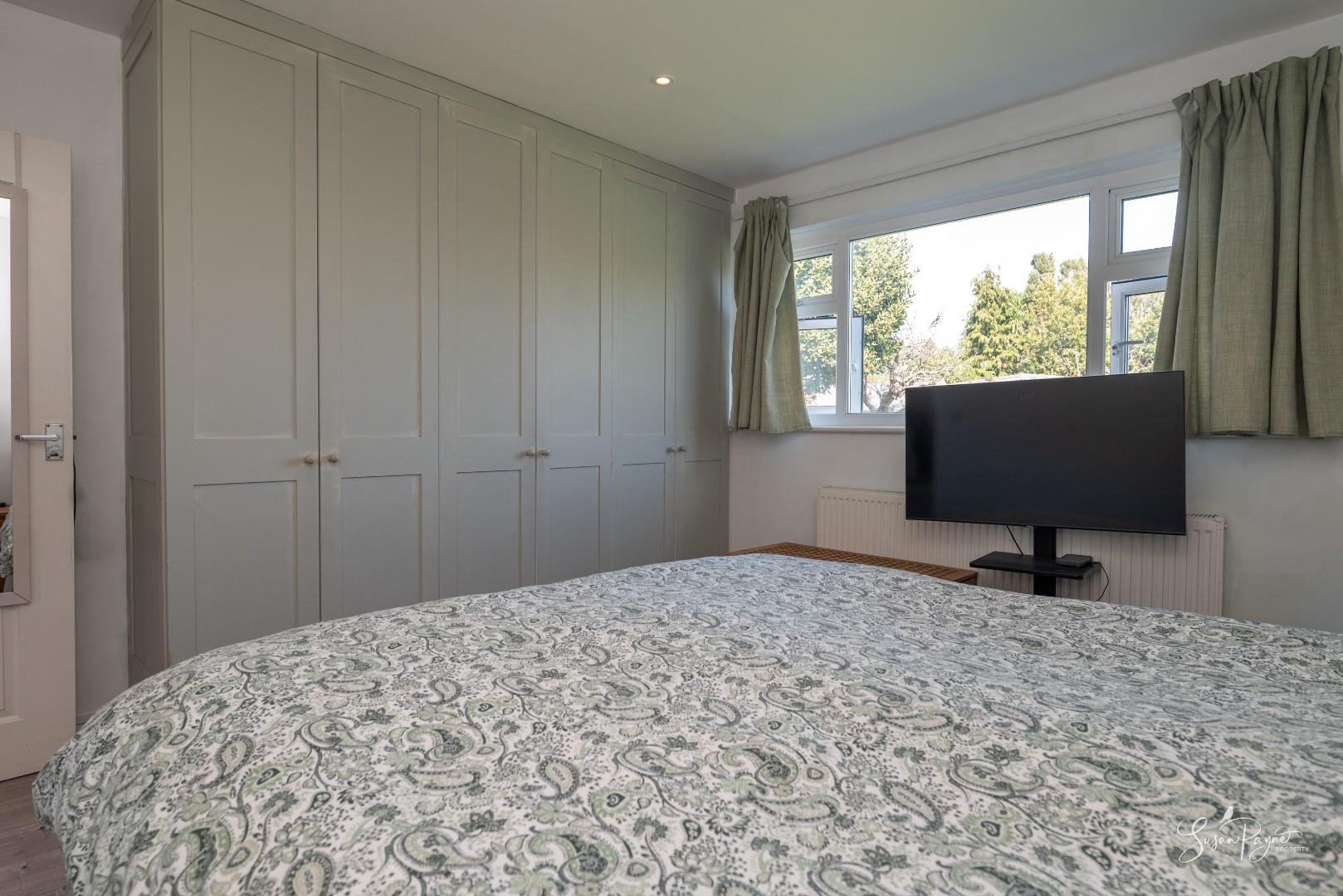 A comfortable double bedroom with an abundance of useful and attractive built-in storage and a lovely outlook over the rear garden.