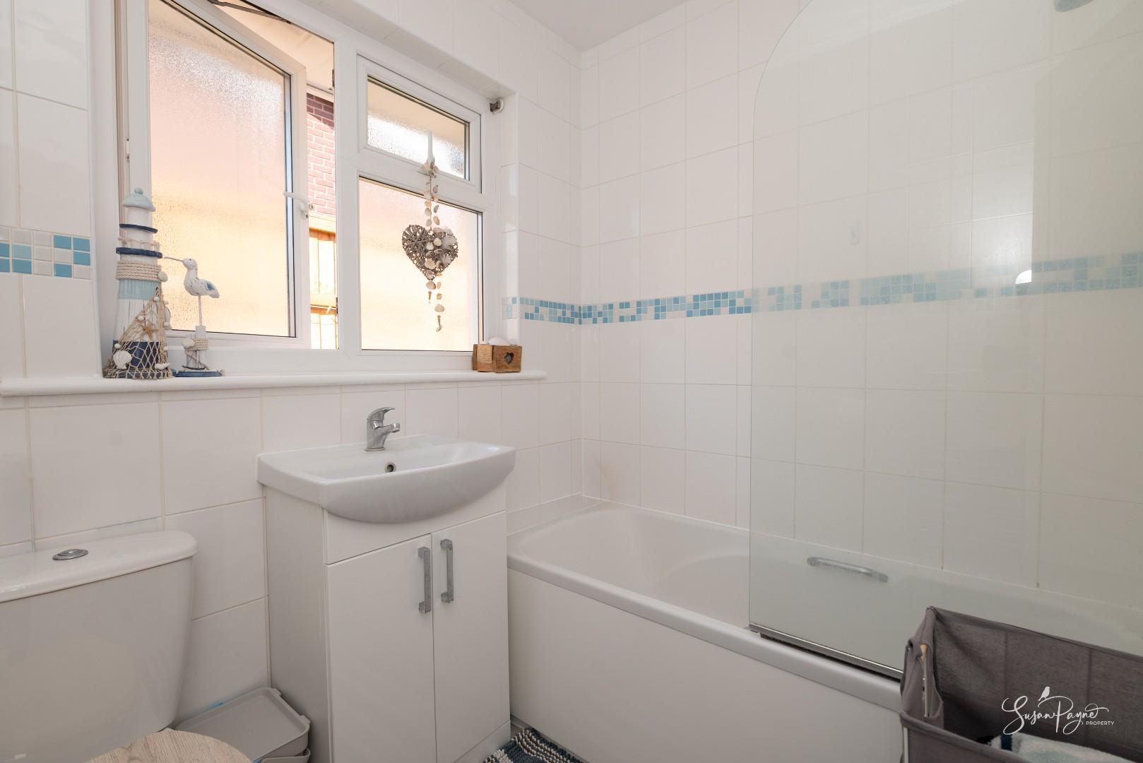 The bathroom is fitted with a modern suite including bath with shower over, wash basin and WC, finished in a clean and neutral style. A window has patterned glass for privacy, and there is a heated chrome towel rail.