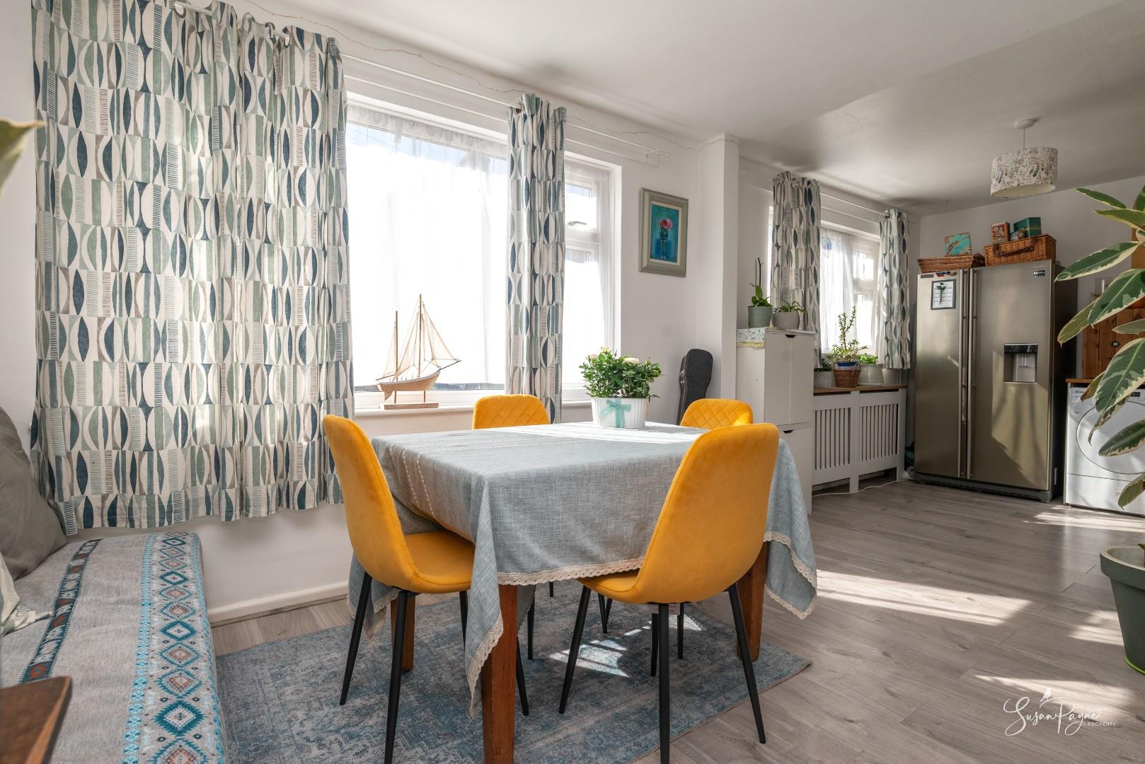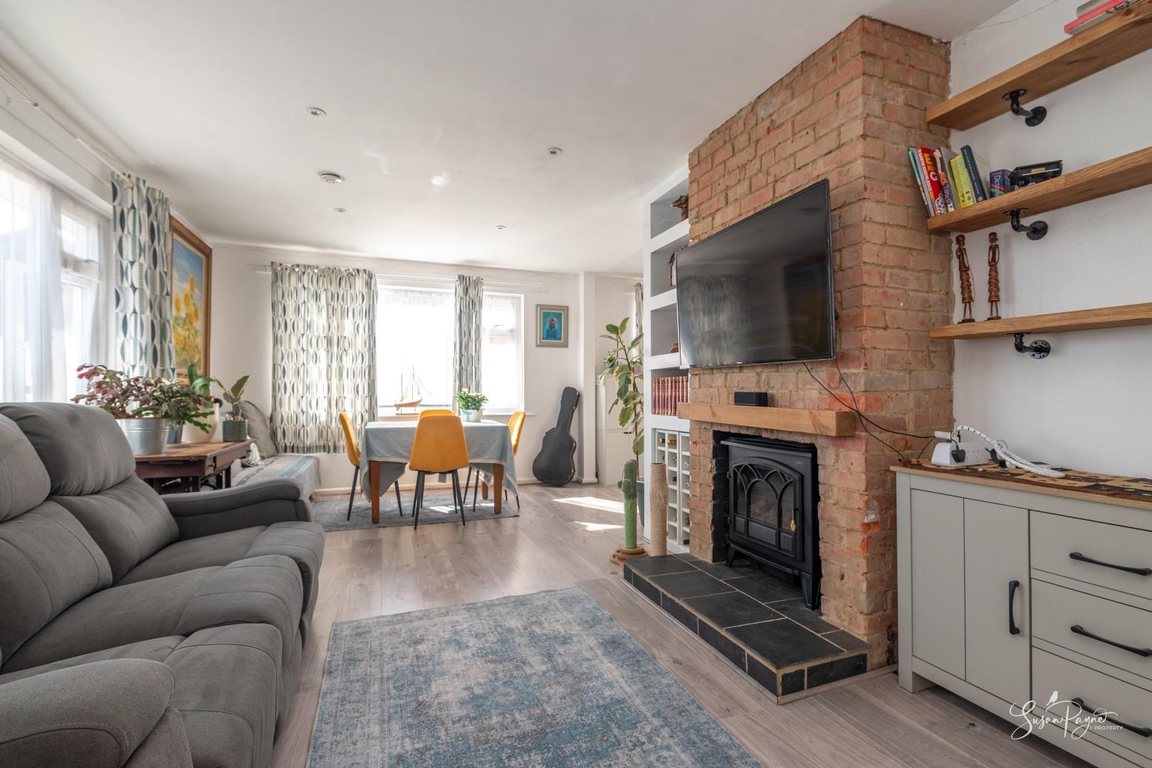 A beautifully bright and spacious open-plan room forming the heart of the home. This is a wonderfully sociable space with clearly defined lounge and dining areas, flowing naturally into the kitchen. Large windows to two aspects fill the space with natural light creating a seamless connection between inside and out, and an exposed brick chimney breast with a tiled hearth adds character.