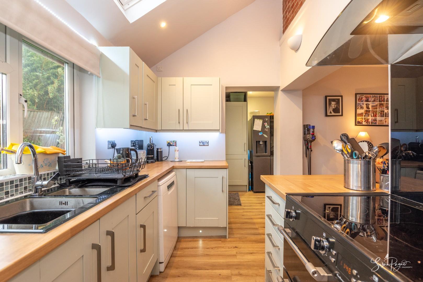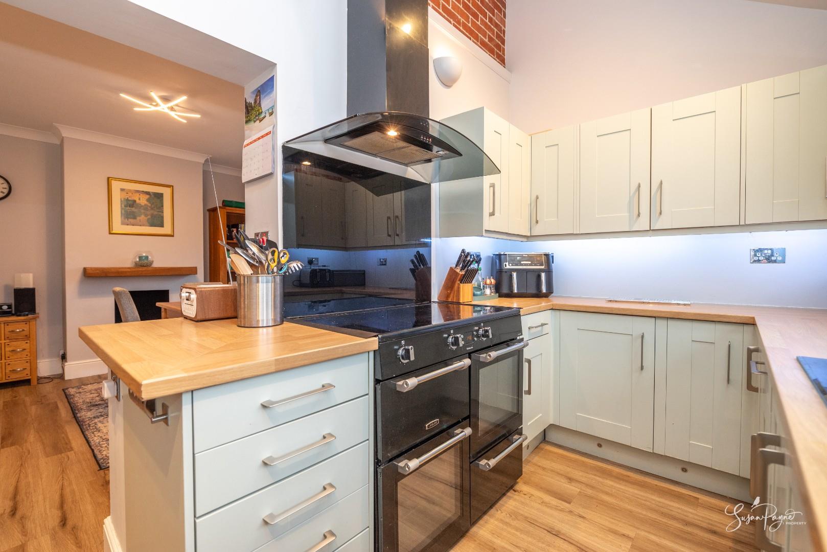 Fitted with a contemporary kitchen finished with soft pastel cabinetry, solid wood worktops and integrated lighting, a range-style cooker with an extractor over forms a central focal point, while generous storage and preparation space make this an ideal kitchen for family life. There is undercounter space and plumbing for a dishwasher, plus there is space for an electric range-style cooker. A window to the rear offers views over the garden and the fabulous, vaulted ceiling features a Velux window, maximising the natural light in the space.