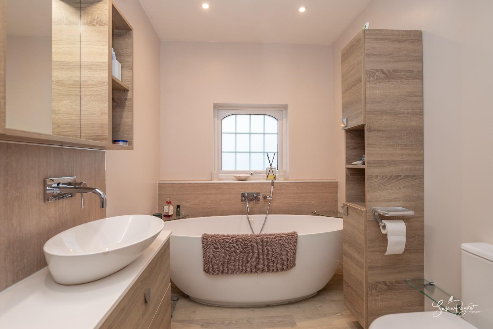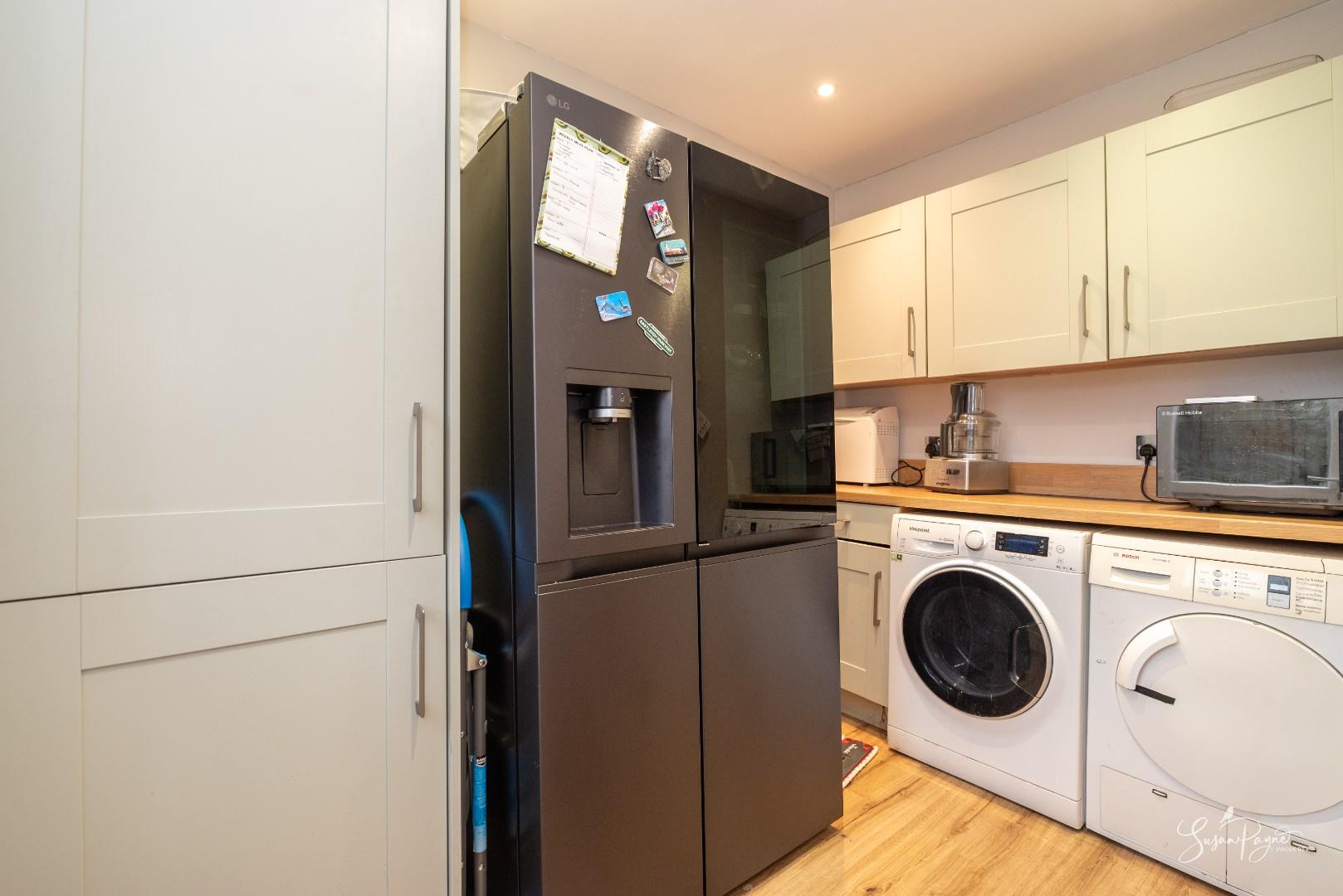 The practical and well-organised utility room offers additional storage, under-counter space for two appliances, and space for a large fridge freezer. A door provides direct access to the rear garden, and the recently replaced gas boiler is concealed within the cabinet.