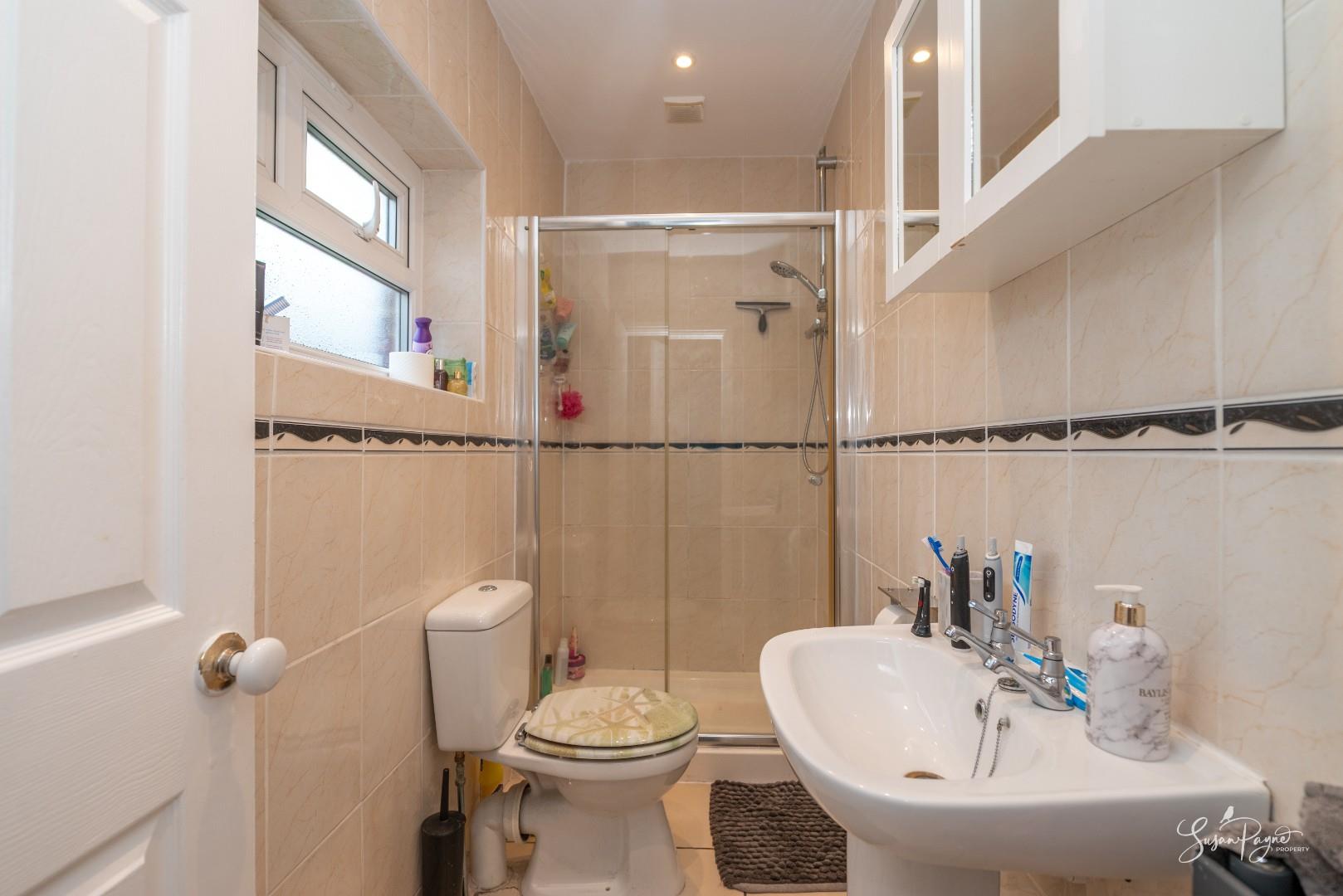 Neatly appointed with a glazed shower enclosure, WC and wash basin, the space is finished with neutral tiling, recessed lighting and an obscure glazed window for privacy.