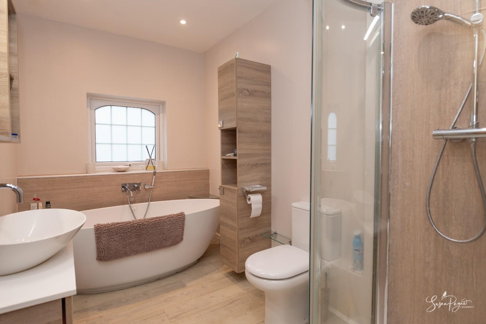 A stylish and luxurious family bathroom featuring a freestanding bath, separate glazed shower enclosure, contemporary vanity unit and WC. Finished with wood-effect flooring, modern tiling and recessed lighting for a spa-like feel.