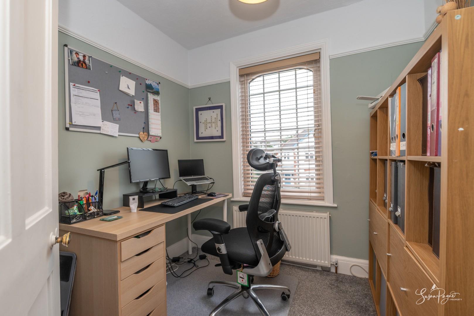 A versatile room currently used as a home office, equally suited as a single bedroom or nursery. A front-facing window and practical layout enhance its flexibility.