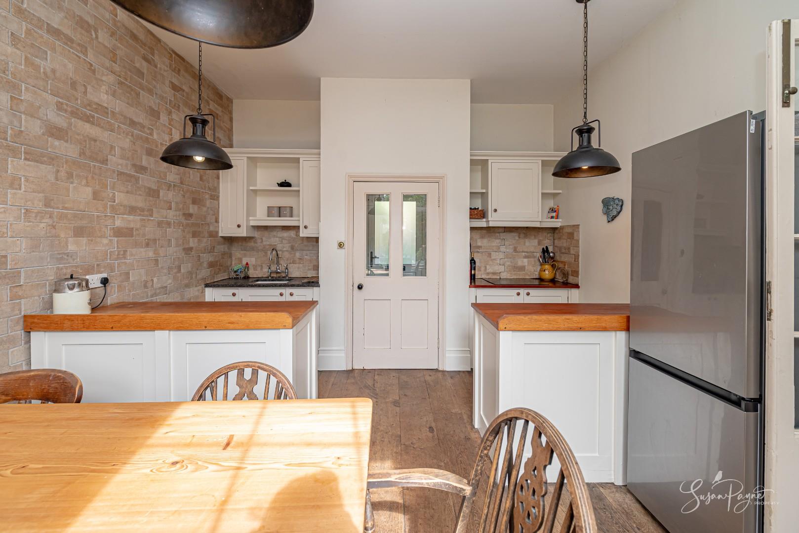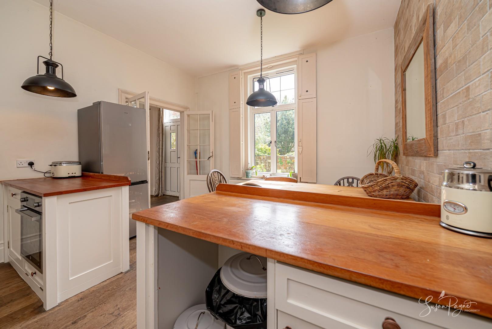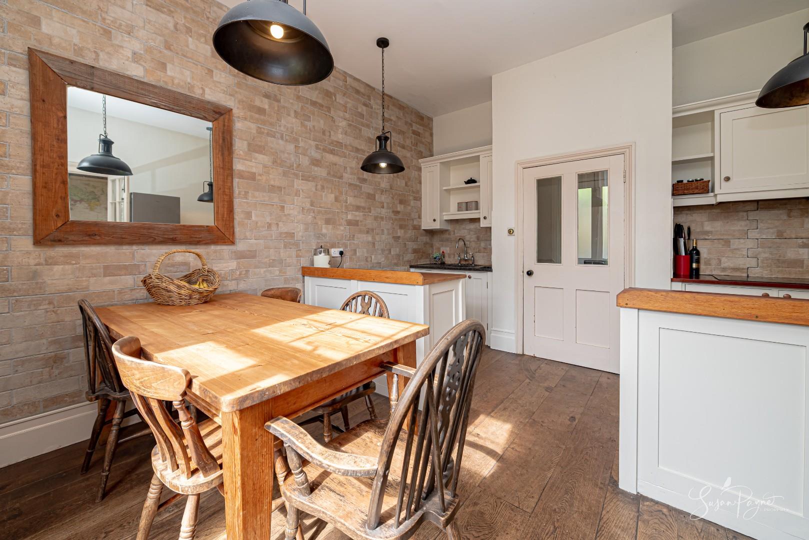 The kitchen/dining room is both stylish and welcoming, designed as a true hub of the home. Shaker-style cabinetry is complemented by warm timber worktops and textured brick-style tiling, creating a timeless, country-inspired feel. The space is beautifully light, with a window overlooking the garden and drawing in natural greenery. There is ample room for a large family dining table, making it ideal for both everyday living and relaxed entertaining, while the thoughtful layout ensures practicality and ease of use. Beautiful timber floors flow though a pair of fabulous glazed doors into the sitting room.